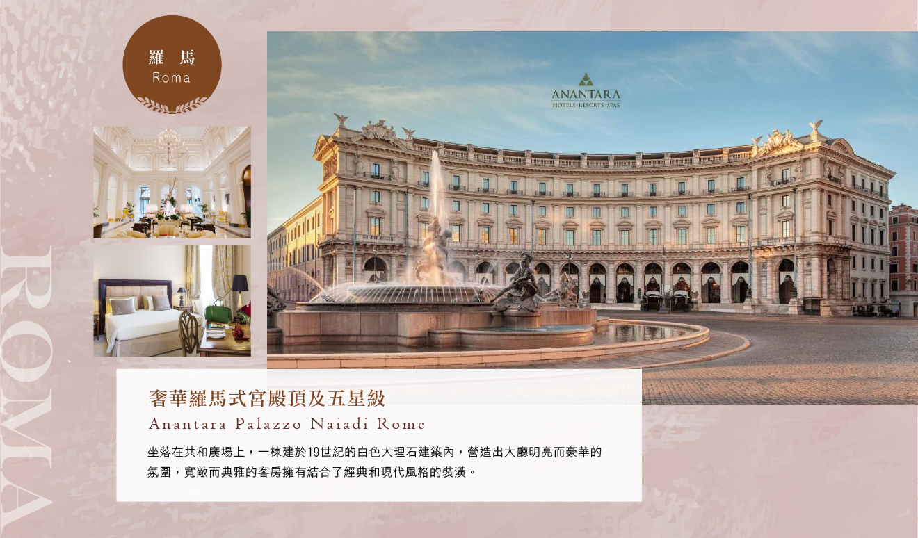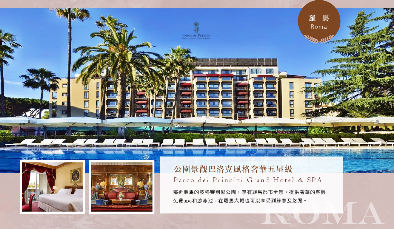 住宿:Anantara Palazzo Naiadi Roma Hotel 或 Baglioni Hotel Regina 或 InterContinental Rome Ambasciatori Palace by IHG 或 Parco dei Principi Grand Hotel & SPA 或同等級