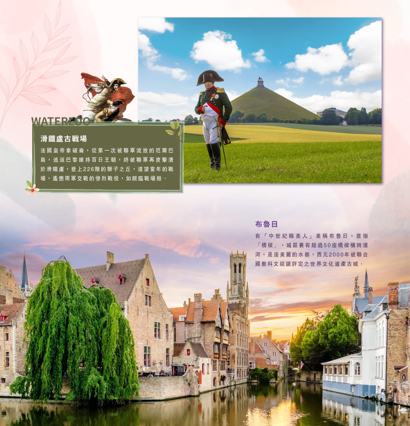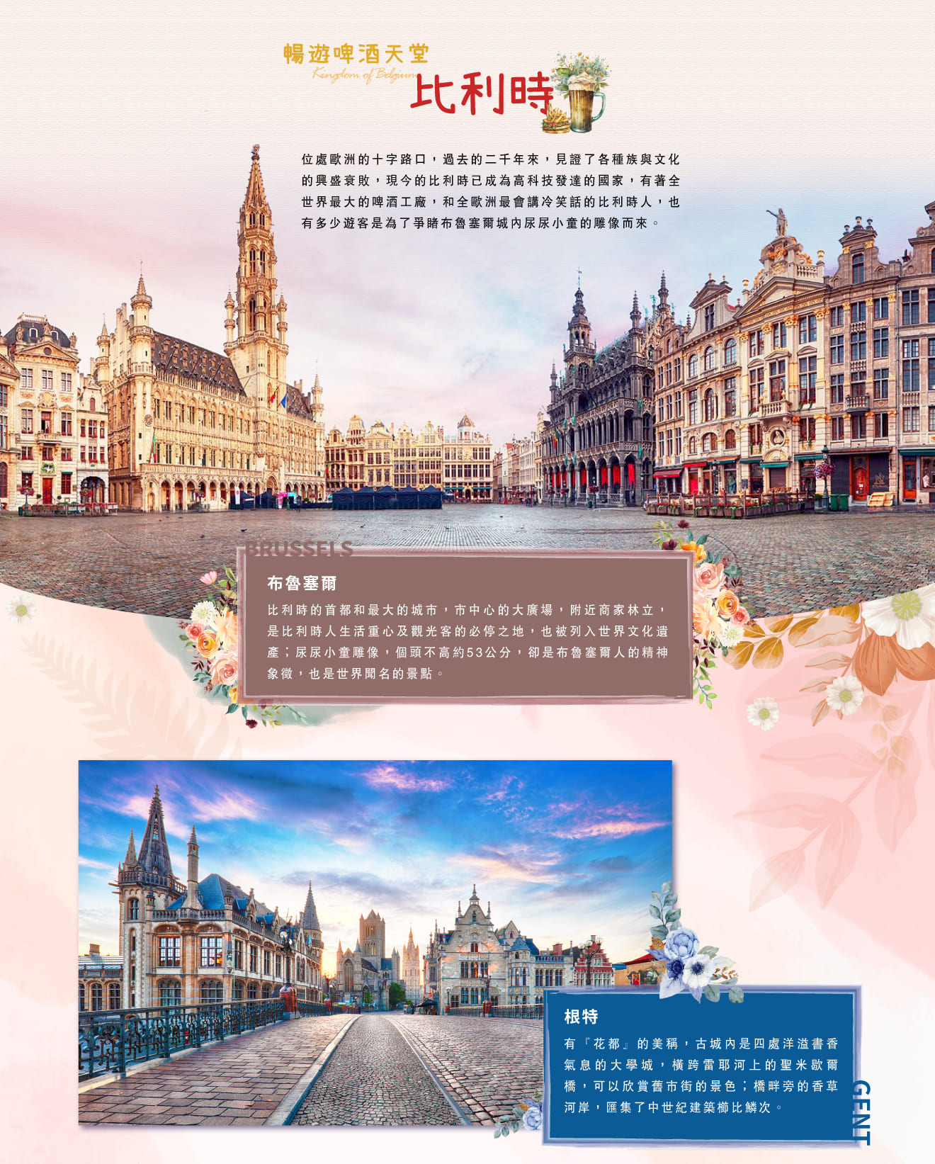 ■布魯塞爾,比利時的首都和最大的城市,也是歐洲聯盟的主要行政機構所在地,三個主要機構中,歐盟委員會和歐盟部長理事會都位於布魯塞爾,歐洲議會在布魯塞爾也有分處(全體議會在法國斯特拉斯堡),另外,北大西洋公約組織的總部也設於此地,所以它有歐洲首都的美譽;暢遊於市中心的■大廣場,附近商家林立,是比利時人生活重心及觀光客的必停之地,也被列入世界文化遺產,19世紀法國大文豪雨果稱為是「世界最美麗的廣場」,廣場上市政廳、國王之家、中世紀商會......等古典建築林立,及著名的海鮮美食街皆值徒步漫遊;■尿尿小童雕像,個頭不高約53公分,卻是布魯塞爾人的精神象徵,也是世界聞名的景點,■聖赫伯特購物拱廊,新藝術風格的室內購物街,有咖啡館、著名的巧克力食品店及具特色商家;特別招待◆最好吃的鬆餅。