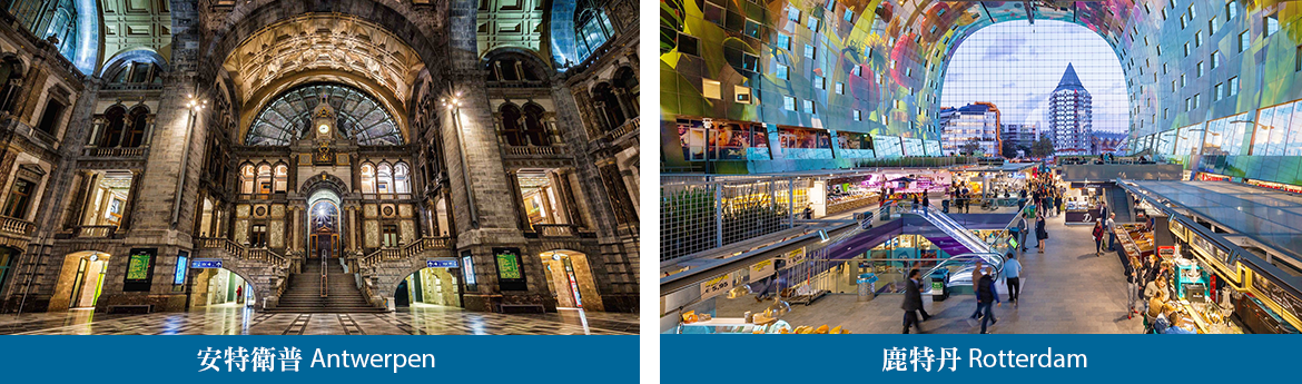 ■鹿特丹,荷蘭第二大都市,也是萊茵河入海口,在第二次世界大戰中被德軍徹底破壞,如今已成為摩天大樓林立的都會區,更是新銳建築師的創意天堂,展開市區觀光由建築師Piet Blom在1984年所建造,房子傾斜 45 度的立體方塊屋、中央圖書館、布萊克車站及一座790公尺的斜拉橋,連接鹿特丹北部和南部暱稱為天鵝橋等;特別造訪2014年10月歷經5年工程期的 ■Markthal新藝術風格市場,早上10點到晚上8點營業,是由荷蘭知名建築事務所MVRDV設計,他們擅長以奇幻結構的建築而名聲大噪,玻璃圓弧馬蹄拱狀造型相當吸晴,圓頂天幕可看到各類五彩繽紛的新鮮蔬果的多媒體投影圖樣環繞,而兩旁玻璃帷幕,是搭配當地藝術家Arno Coenen和Iris Roskam的「Horn of Plenty」超大壁畫,走進整個市場裏宛如置身一座絕美壯麗的藝術殿堂,令人驚豔。