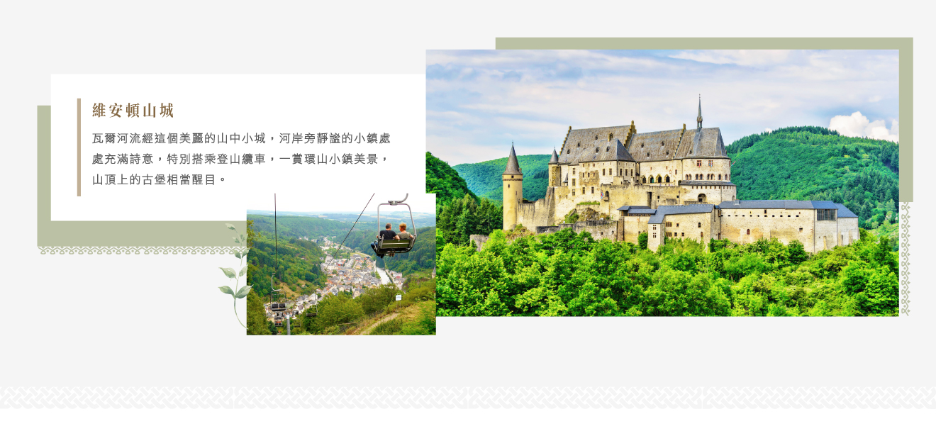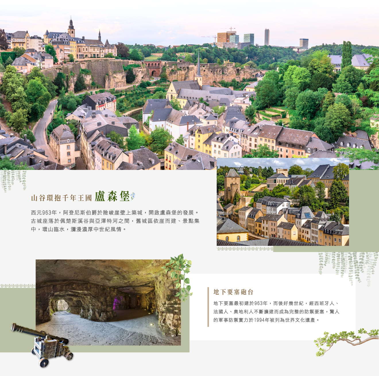 ■盧森堡大公國位於歐洲的內陸國家,也是現今歐洲大陸僅存的大公國,首都盧森堡市;盧森堡是歐盟成員國,由於其地形富於變化,又位處於德、法二國交通要道,地勢險要,一直是西歐重要的軍事要塞,有北方直布羅陀的稱號。