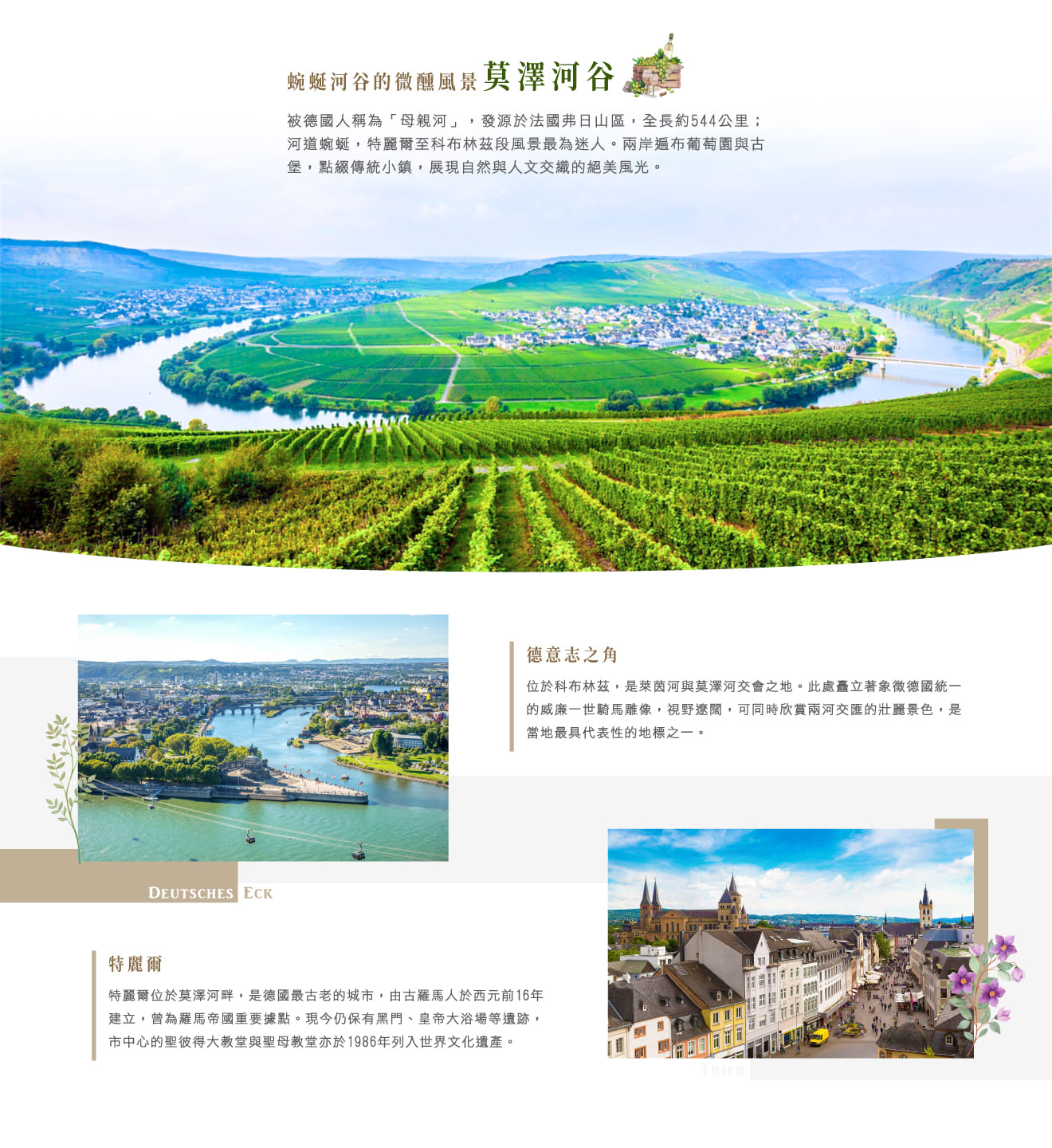 ■莫澤河谷,德國人將其稱為母親河,河水源自法國東北部弗日山區,長約544公里河面不寬但蜿蜒曲折,位於德國特麗爾及科布林茲之間的河谷風景最令人驚豔,以葡萄種植世界聞名,兩岸葡萄園和山頭古堡形成自然和人文和諧之美,沿岸多傳統特色之小鎮,堪稱德境最美的河谷。