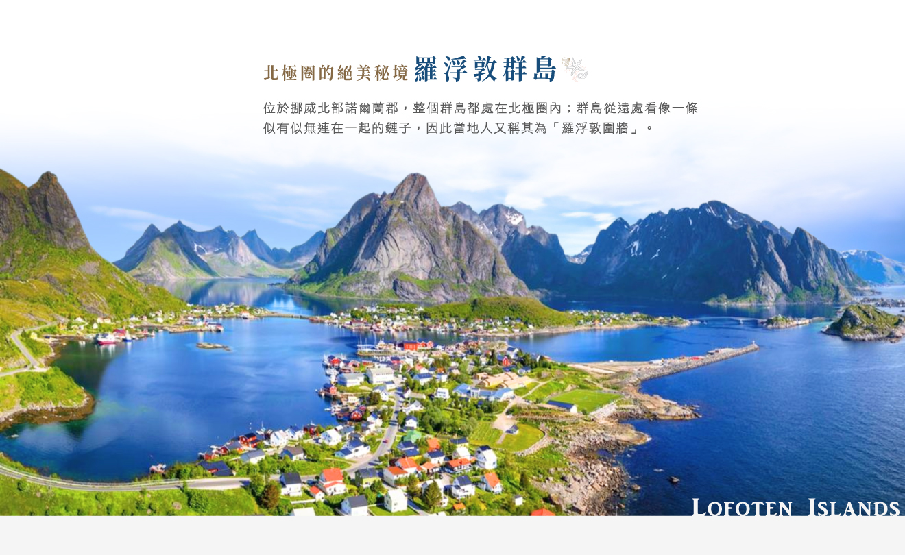 ■羅浮敦群島位於挪威北部諾爾蘭郡,整個群島都處在北極圈內,氣候嚴寒風景如畫,主要居民是維京人約有24500人;群島從遠處看像一條似有似無連在一起的鏈子,因此當地人又稱其為“羅浮敦圍牆”, 而羅浮敦一詞在挪威語中是山貓腳的意思,面積約1425平方公里,南北延伸約111公里,島上多沼澤、山丘,最高峰1161公尺,四周海域盛產鱈魚、鯡魚,捕撈後多製成魚乾和燻魚,島峰由花崗岩和火山岸構成,經歷冰河時代冰川的沖刷、削鑿,從而形成了現今幾乎可與阿爾卑斯山脈相媲美的曠野以及壯觀的地貌,與挪威大陸隔Vestfjorden峽灣相望。