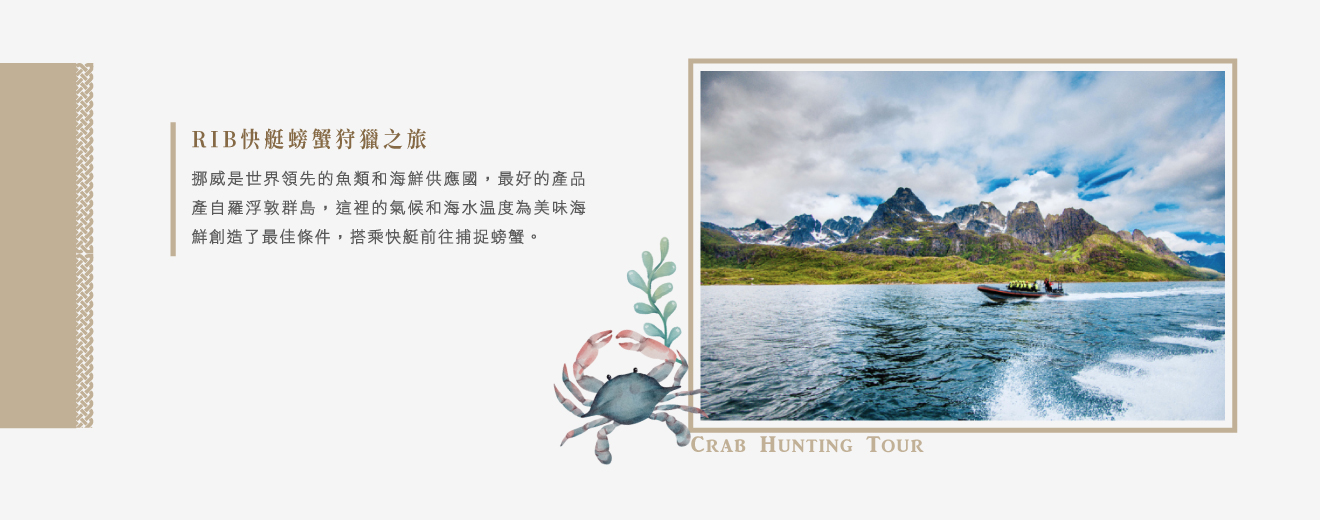 ★RIB快艇螃蟹狩獵之旅,挪威是世界領先的魚類和海鮮供應國,最好的產品產自羅浮敦群島,這裡的氣候和海水溫度為美味海鮮創造了最佳條件,搭乘快艇前往捕捉螃蟹;隨後品嚐正港新鮮的螃蟹美味。