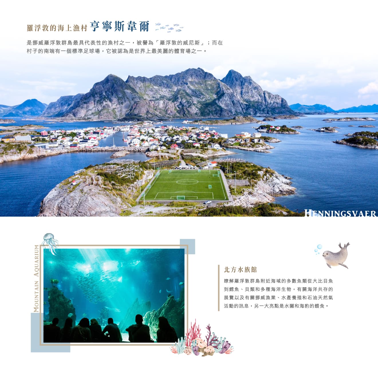 ■亨寧斯韋爾,位在Heimøya和Hellandsøya兩個主要島嶼上,面積僅0.3平方公里四周都被湛藍海水包圍,人口500多人,兼具文化與戶外探險的美麗漁村,因為海灣像運河一樣深入小島中央,而有著羅浮敦威尼斯的美名,傳統的漁村建築吸引了眾多遊客造訪,附近的登山健行和海域潛水一直是最熱門的活動,而在村子的南端有一個標準足球場,它被認為是世界上最美 麗的體育場之一,就在北極圈不遠處可以俯瞰美麗的挪威海。