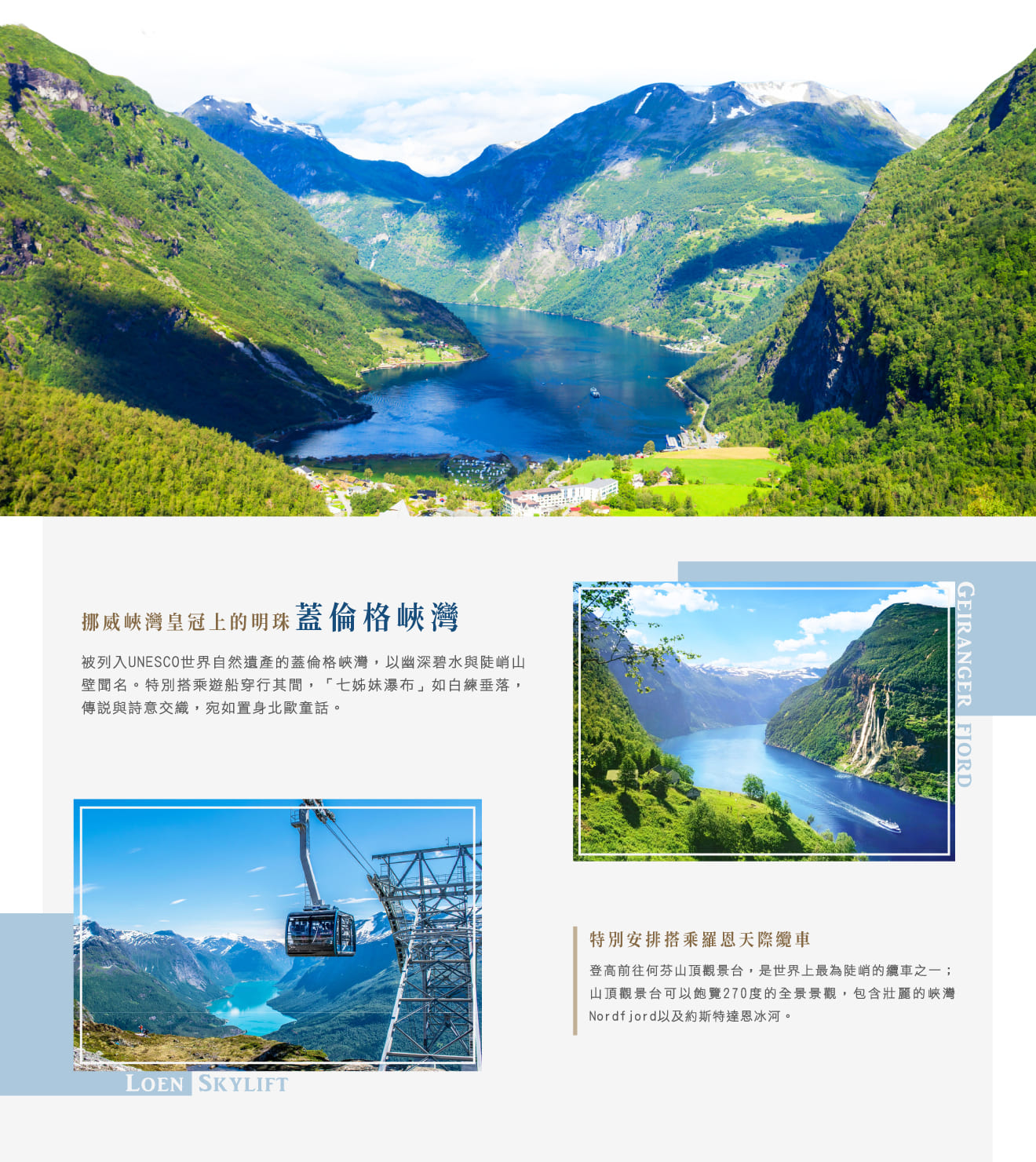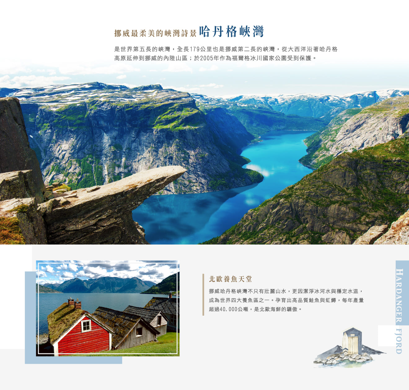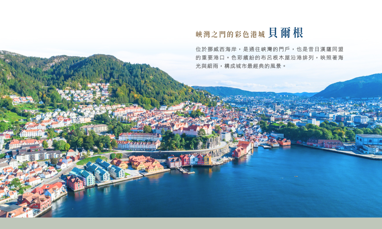 通過2014最新落成高空哈丹格大橋橫渡南挪威最大的峽灣哈丹格峽灣,沿途風景如畫,令人感歎大自然鬼斧神工之美,清澈深幽的海水,高峻挺拔的山峰,襯托出一幅讓人凝視的山水奇景;隨後,前往挪威最美的峽灣之都美稱■貝爾根,位於挪威的西南方,剛好位於「七大山」的中間,是西挪威的非正式首都,也是挪威對外的大門,因為其峽灣地形適合大型船隻操作,令卑爾根成為歐洲最大的遊輪港之一〫