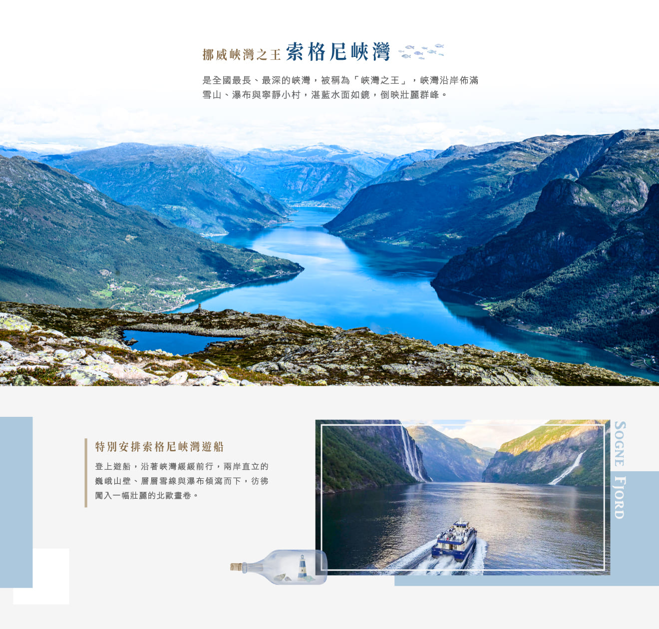 ■索格尼 Sogne峽灣區,素有“峽灣之王”的美名,全長約205公里,★搭乘遊船感受兩岸美景,沿途飛瀑流泉、峻山險嶺,美景處處令人驚喜。