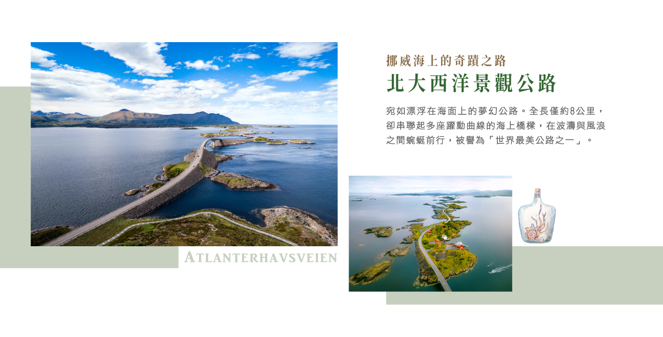 今日清晨不急著離開這美麗的濱海旅館,偷個懶、晚點起床,坐在面海景觀的餐廳好好享受豐富的寧靜早餐,向前一望即是浩瀚攝人的北大西洋,美景當前令人相當難忘。繼續探索挪威的公路奇蹟■北大西洋景觀公路,位於挪威西海岸,在冰河作用侵蝕切割所形成的海岸線上,車行走公路上,彷彿在一個個的島嶼間跳躍,也欣賞道路兩側美景。