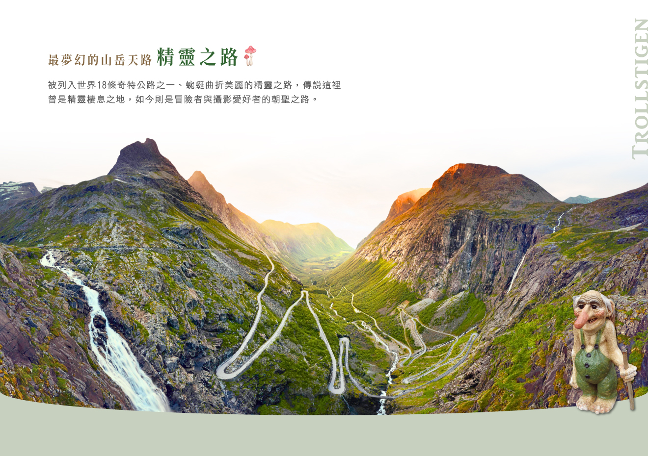 沿著63號公路行走,經過一段彎曲的上坡路,就是挪威黃金公路之一的◆老鷹之路(需視天候安全因素開放與否),俯瞰峻峭的山壁和蔚藍深邃的峽灣交織成的美景,令人感到不虛此行。接下來換搭渡輪,這是峽灣間很平常的交通工具;前往是被列入世界18條奇特公路之一、蜿蜒曲折美麗的◆精靈之路(需視天候安全因素開放與否),傳說中的挪威侏儒精靈就住在這片峭壁森林裡;山路蜿蜒盤旋整面山谷,車子行進在數個髮夾彎道,有如在「旋轉的梯子」升爬(TROLLSTIGEN挪威語即旋轉的梯子),真是驚險刺激。夜宿莫爾德,是挪威西海岸一個寧靜的小城,有『爵士與玫瑰之城』之稱;每年七月中旬,莫爾德都會舉辦一項全世界最大、最重要且歷史最悠久的國際性爵士音樂節。