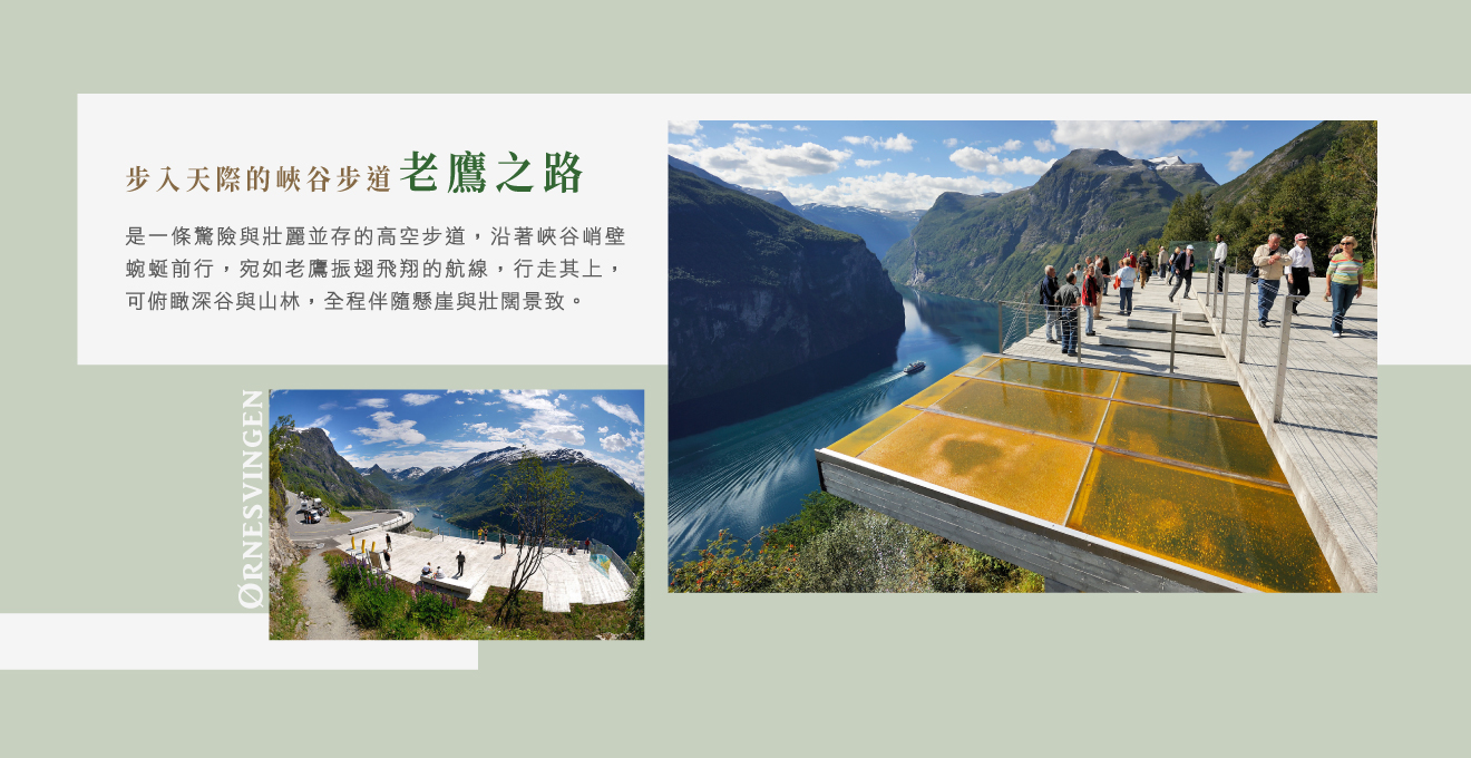 搭乘★蓋倫格峽灣遊船,峽灣裡最著名的景點就是「七姐妹瀑布The Seven Sisters Waterfalls」,沿途古木怪石、白瀑垂廉的峽灣、一上路貪食的海鷗振趐相隨,也算是一景。峽灣之美,在其壯麗的大自然,倒影如畫的山水、鄉村風光,以及入夏之後的各色野花,我們和水鳥、山雀一起捕捉北國短暫的夏季”春”色吧!蓋倫格到Andalsnes這段山路,總稱為黃金之路(Golden Route);這段公路由挪威政府耗費巨資歷經千辛萬苦建造完成的崖壁公路,此公路順著峽灣盤繞著陡峭的山壁開鑿,山勢險峻,工程艱鉅,沿途的風光更是令人難忘。