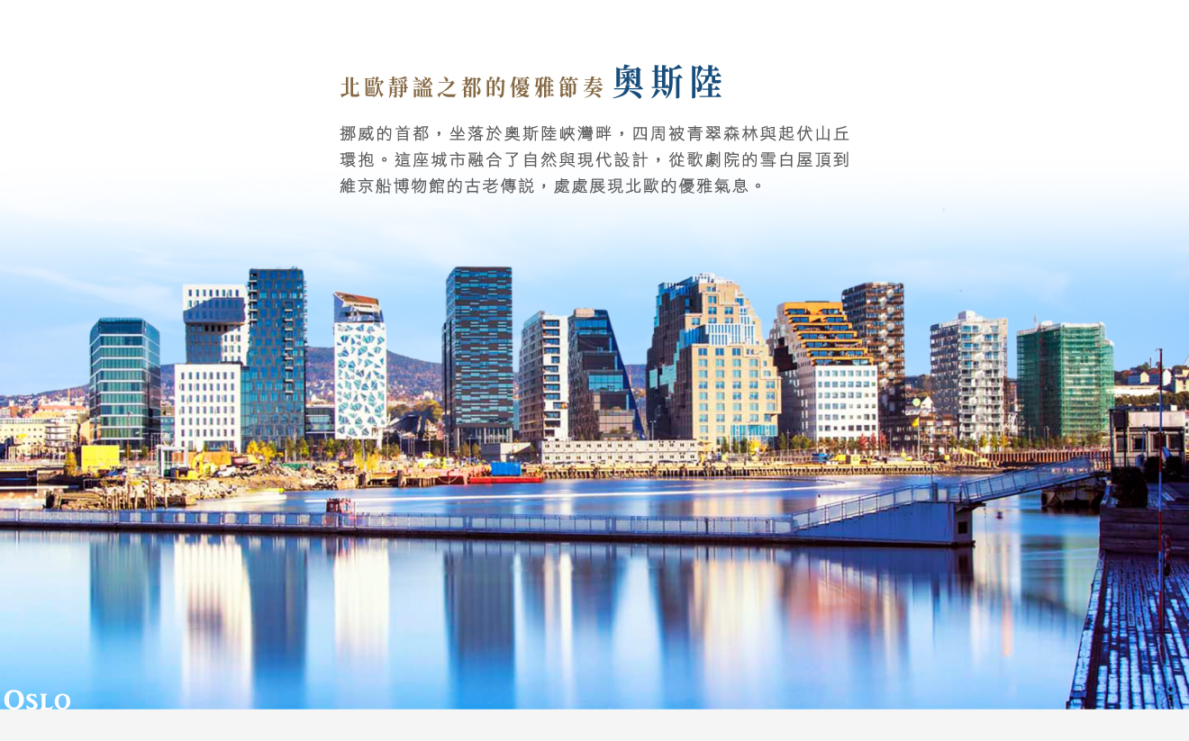 住宿:奧斯陸 Grand Hotel 或 奧斯陸Bristol 或 奧斯陸Continental 或 Sommerro 或同等級