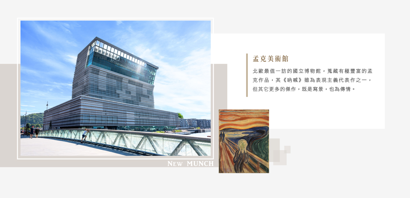 ◆孟克美術館(或依展期參觀國立博物館),蒐藏有極豐富的孟克Munch 作品,其”The Scream驚叫”雖為表現主義代表作之一,但其它更多的傑作,既是寫景,也為傳情,在遊覽峽灣之後再來欣賞其作品,尤令人感動。