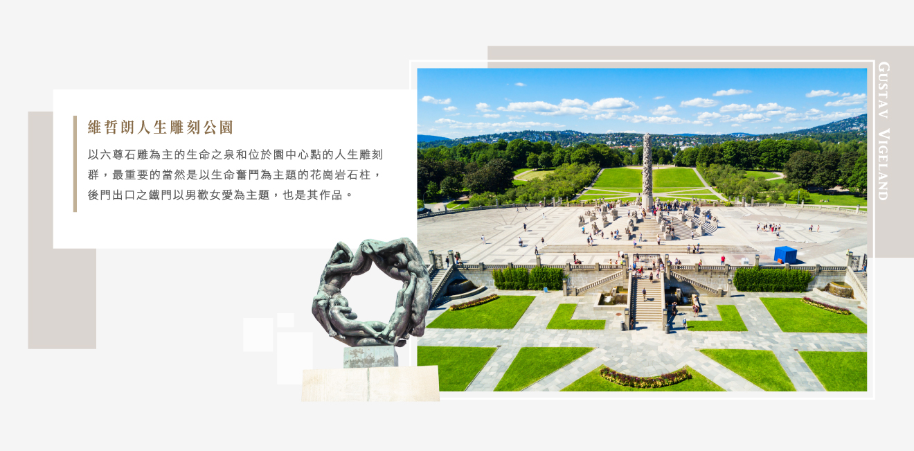 ■維哲朗人生雕刻公園Gustav Vigeland,包括有58座銅像的長橋,以六尊石雕為主的生命之泉和位於園中心點的人生雕刻群,最重要的當然是以生命奮鬥為主題的花崗岩石柱Monoliten,後門出口之鐵門以男歡女愛為主題,也是其作品。