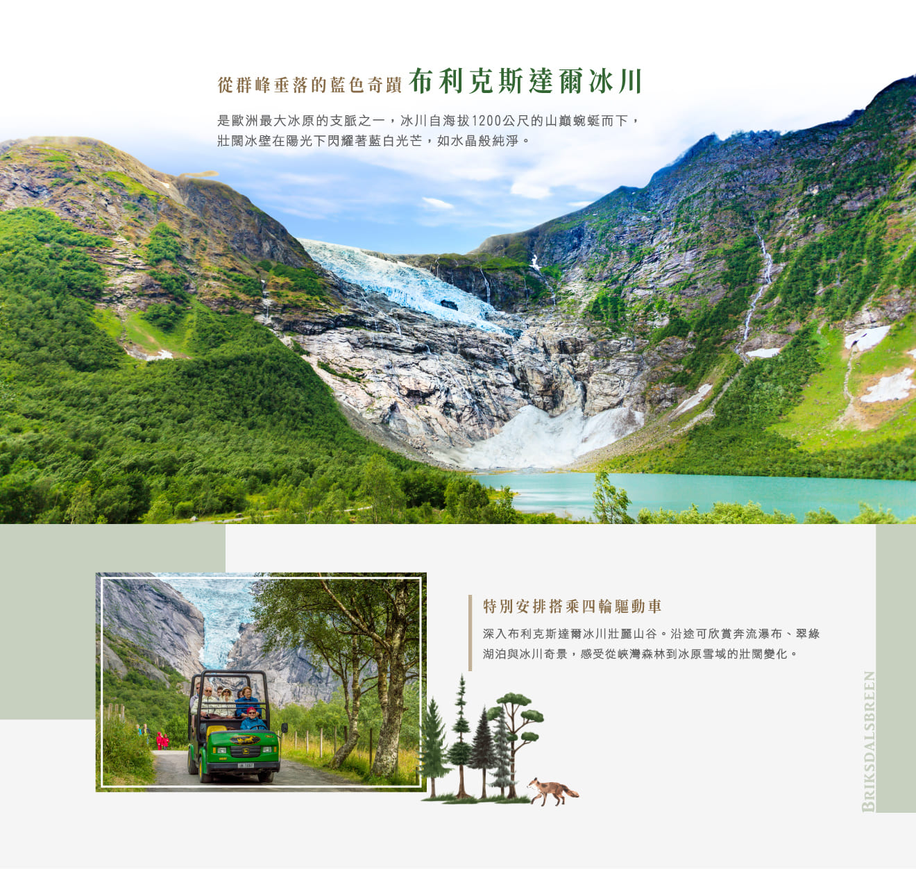 特別安排搭乘★四輪驅動車,悠遊登上歐洲大陸最大之冰河■約斯特達恩冰河,歐洲大陸最大的冰河,面積達487平方公里,擁有50多個分支,包括著名的布利克斯達爾布林冰河和尼加斯布林冰河。約斯特達爾冰河是松恩-菲尤拉訥郡(Sogn og Fjordane)、約斯特達爾布林國家公園的重要組成部分,壯麗風景,美不勝收。