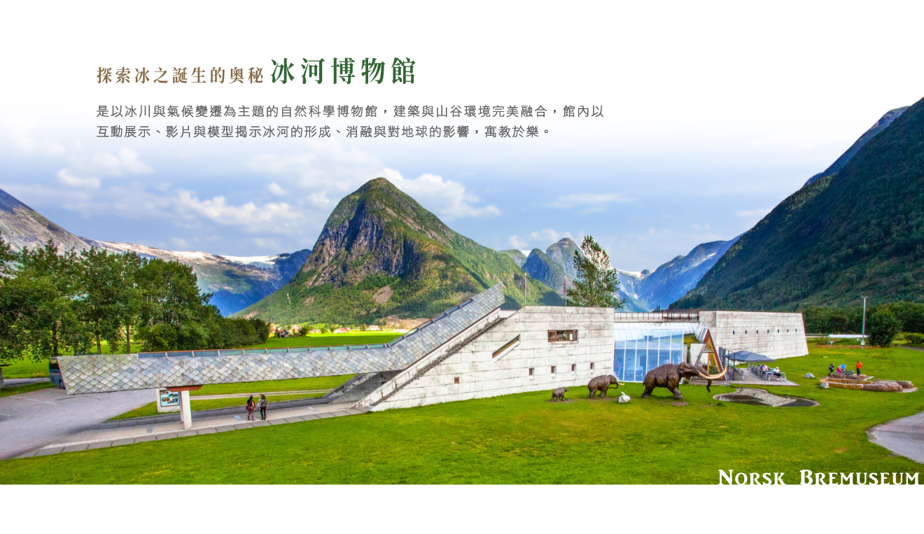 ★冰河博物館,位於松恩峽灣和約特斯達爾冰川之間的Fjærland小鎮,於1991年5月31日開幕,並於2002年擴建,由著名挪威建築大師Sverre Fehn設計,他的作品獲得相當多的國際獎項,包括挪威建築學最高獎A.C.Houen Fund金獎,博物館是由國際冰川學會、挪威徒步旅行協會、挪威水資源和能源局,挪威極地研究所、著名大學建立的非營利性基金會,是互動式博物館,以新的創新方式,為提供有關冰川和氣候的知識,展覽涉及四個主要類別的24個主題,涵蓋了自然和文化歷史中的主題,透過逼真的環繞式電影,瞭解自然環境中人與自然之間的相互作用;各年代時間走廊瞭解人類文明發展史,帶來的環境衝擊及溫室效應後果。
