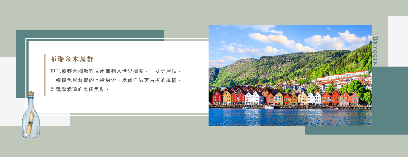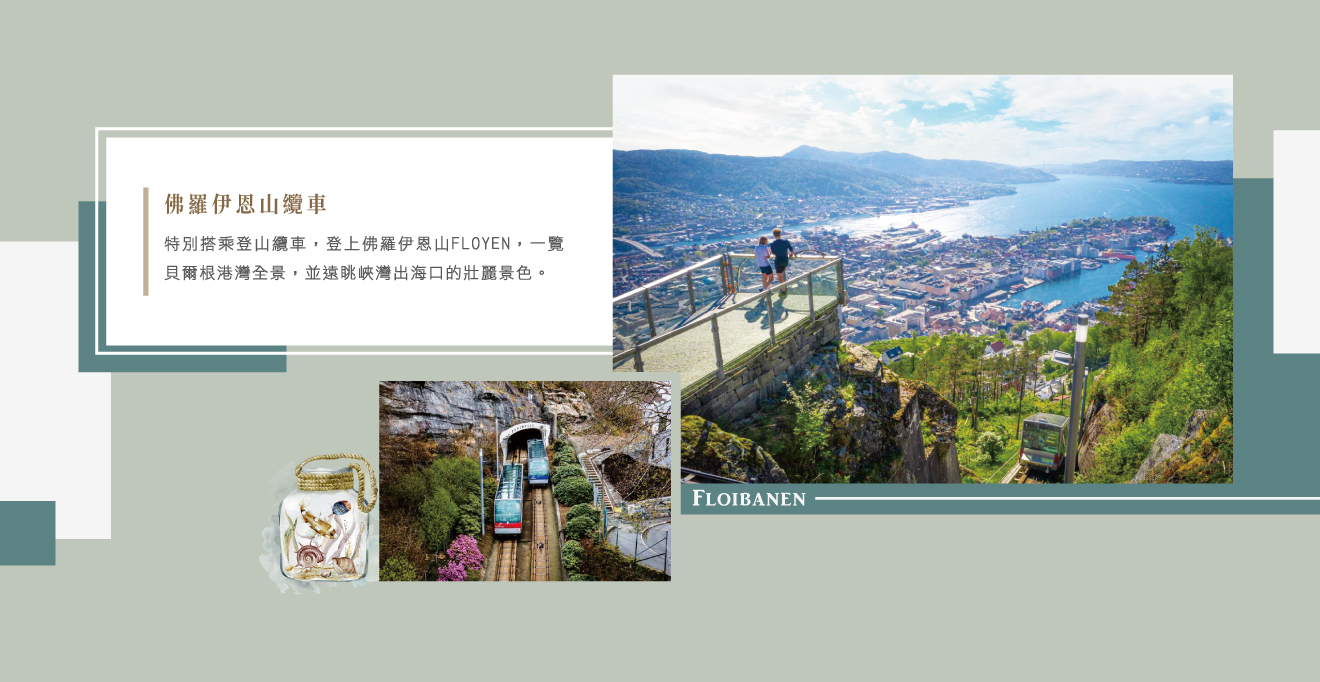 ■布瑞金木屋群,現已被聯合國教科文組織列入世界遺產,一排尖屋頂,一幢幢色彩鮮豔的木造房舍,處處洋溢著古樸的風情,漢薩同盟時期,作為商人的辦公處所及倉庫之用,是獵取鏡頭的最佳焦點;隨後搭乘★登山纜車,登上佛羅伊恩山FLOYEN,一覽貝爾根港灣全景,並遠眺峽灣出海口的壯麗景色。