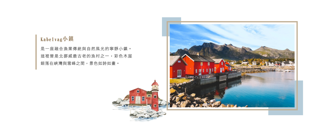 ■Kabelvag小鎮,據稱在史前石器時代即有人類的活動紀錄,也是挪威北方最早在9世紀發展的村落,近郊的Vagan木造教堂在12世紀初由當時國王Øystein Magnusson下令建造,17世紀中期進行擴建和翻新,建築呈十字形設計,使用了近一個世紀,被拆解並移至附近的Værøya島,在舊址幾經數次興建,後來在1898 年又建造現今這座新教堂足以容納來到 Kabelvåg 的所有漁民,名稱被稱呼為羅浮敦大教堂,擁有近1,200 個座位,教堂的建築師是著名的Carl Julius Bergstrøm。