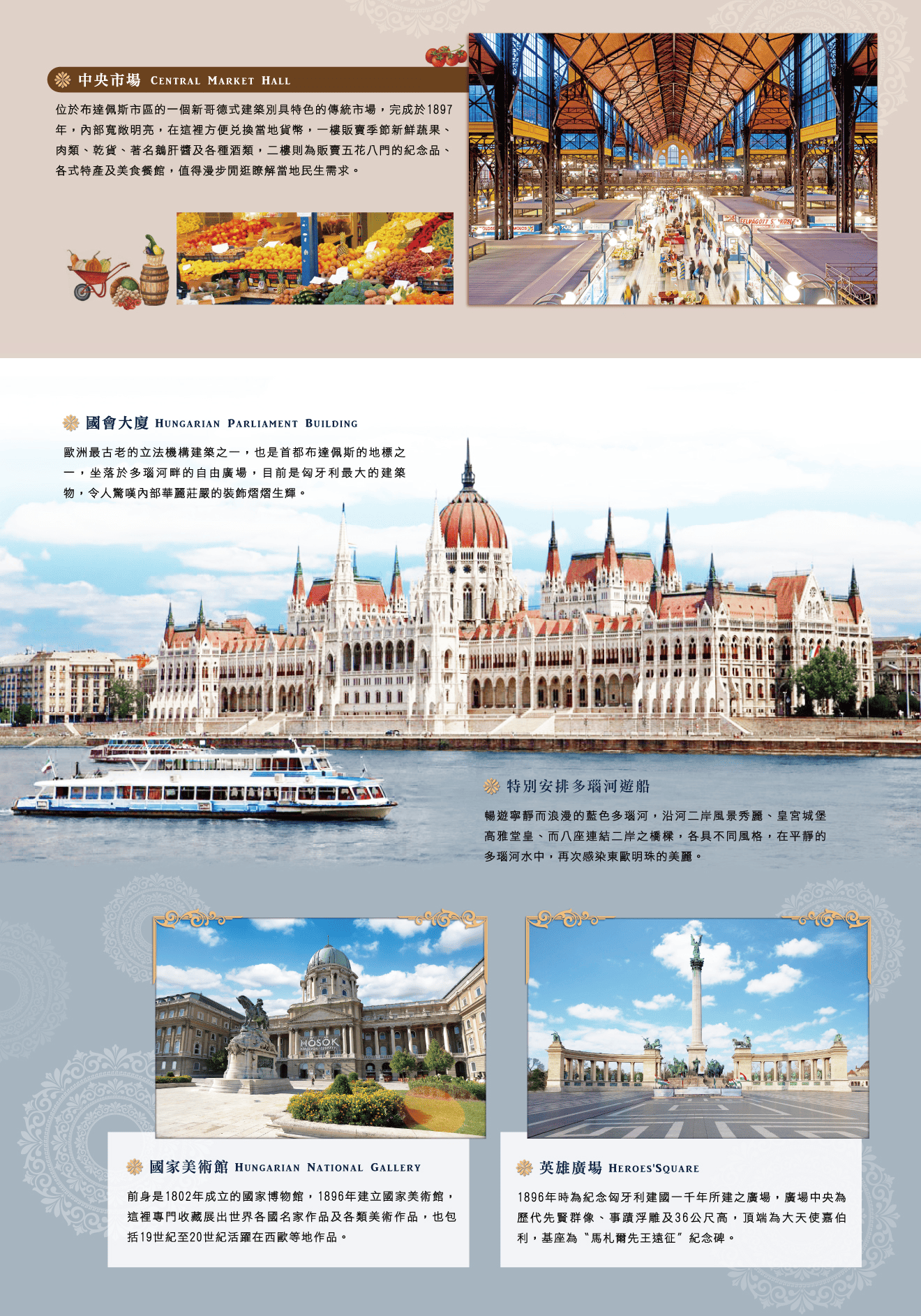 ■布達佩斯,★漁人堡、聖伊斯特萬紀念碑,廿世紀初以中世紀城牆為基礎所改建之古堡,其七座塔樓並已無防禦功能,象徵匈牙利建國之初的七個部落,居高欣賞多瑙河對岸的佩斯全景及多瑙河沙洲瑪格麗特島。★馬提亞斯大教堂,史堤芬王始建於12世紀,後毀於蒙古騎兵,德皇路易於14世紀時重建為哥特式大教堂,16世紀曾被土耳其人改建為回教清真寺,內部多富阿拉伯色彩。