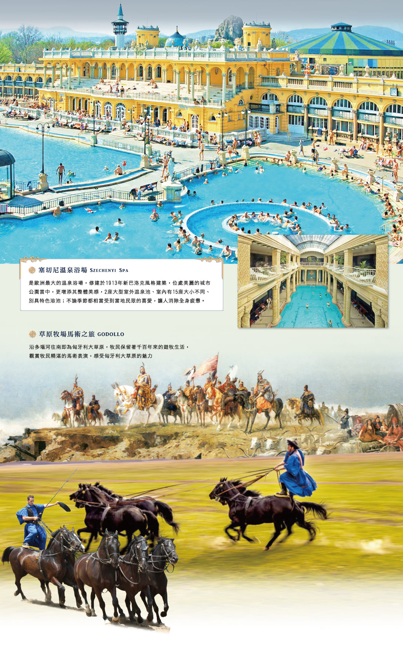 ◆塞切尼溫泉浴場,是歐洲最大的溫泉浴場,修建於1913年新巴洛克風格建築,位處美麗的城市公園當中,更增添其整體美感, 2 座大型室外溫泉池(水溫約為25 °C ~38 °C)、室內有15 座大小不同、別具特色浴池、冰/熱水池、各式各樣的桑拿浴或高溫烤箱(50 °C ~ 70 °C),也可以自費來個精油舒壓按摩;不論季節都相當受到當地民眾的喜愛,讓人消除全身疲憊。