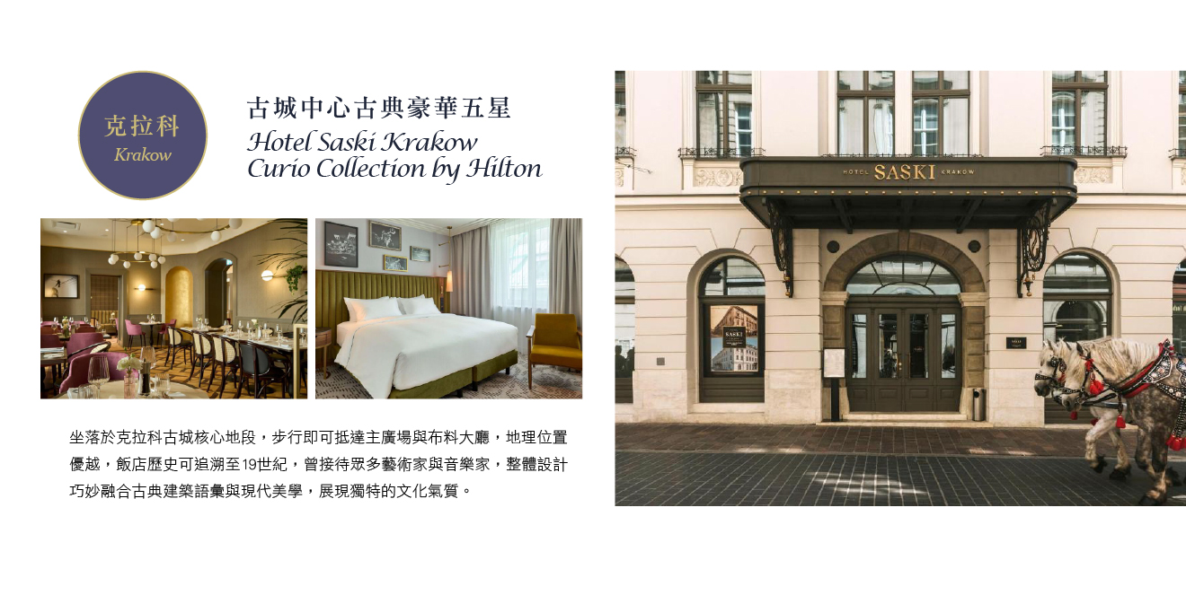 住宿:Holiday Inn Krakow City Centre an IHG Hotel 或 Radisson Blu Hotel 或 Saski Krakow Curio Collection by Hilton 或 Wyndham Grand Krakow Old Town 或同等級