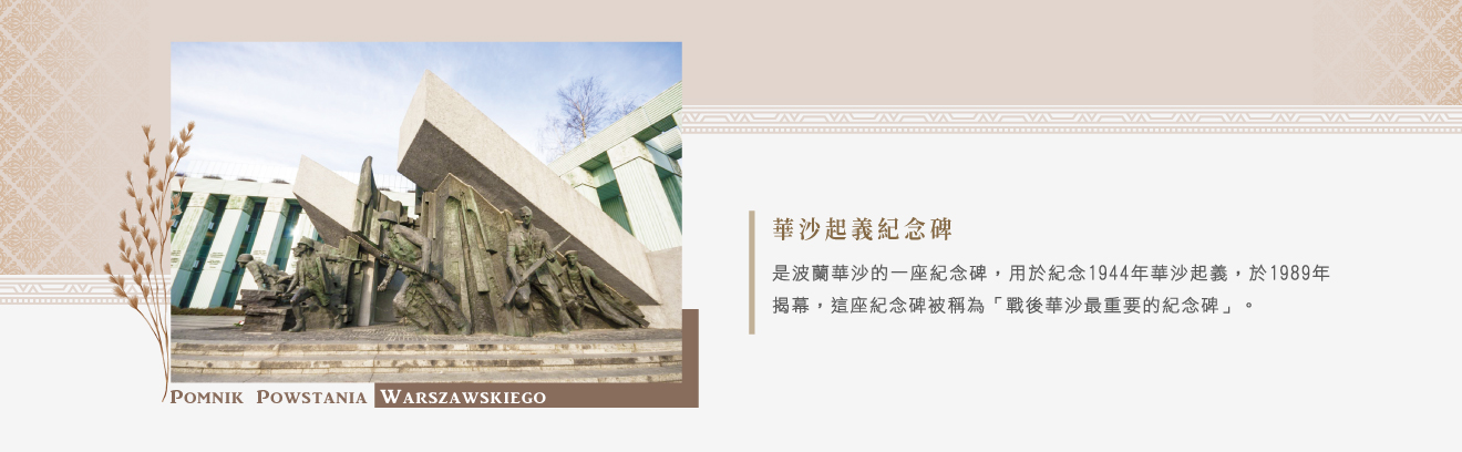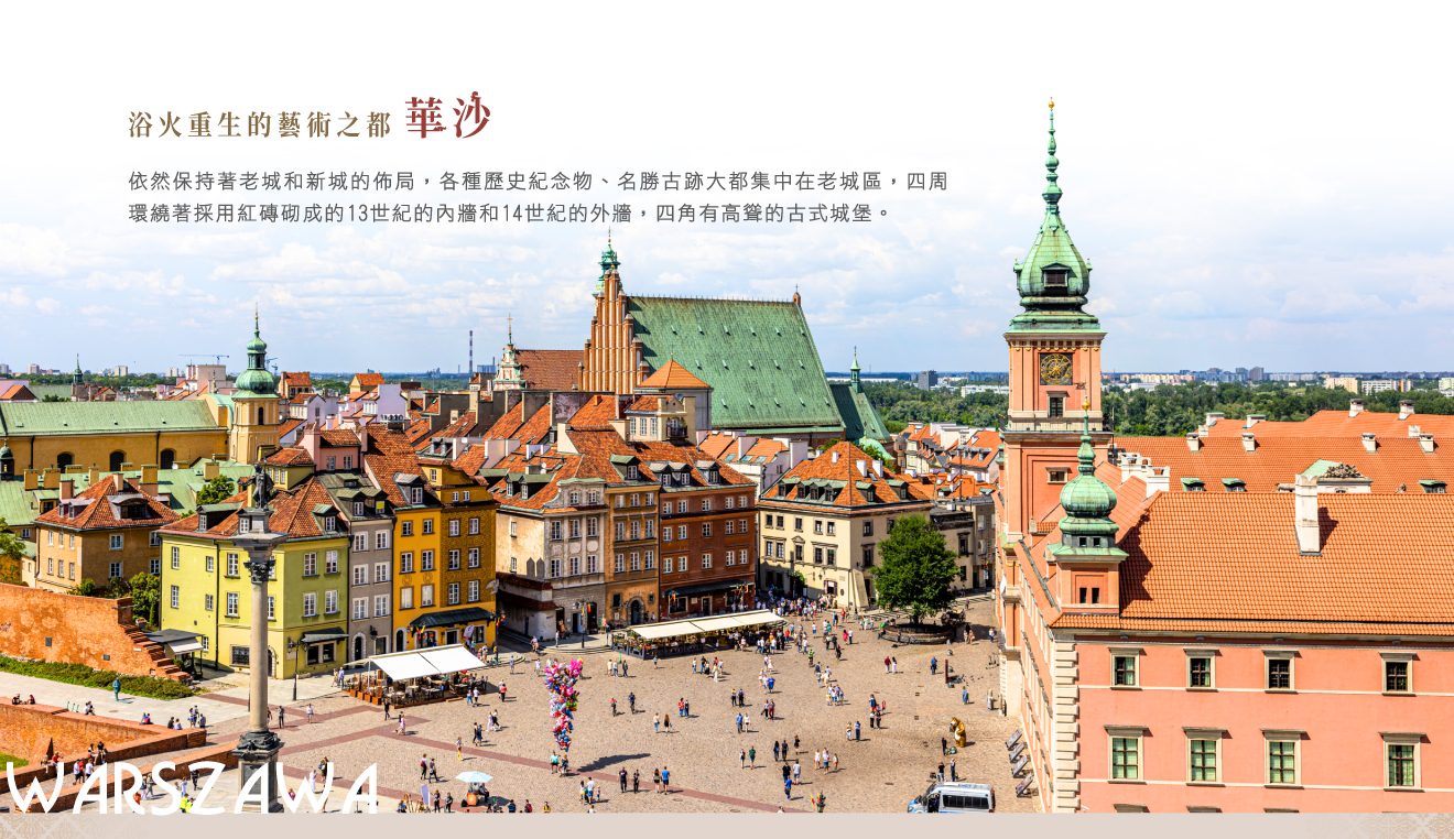 展開市區觀光,沿著街道瀏覽第二次世界大戰後從廢墟中重建的市區,紀念反抗德國納粹佔領軍的■華沙起義紀念碑;矗立於火車站旁的文化科學宮,樓高37層,頂樓高塔達234公尺,是蘇聯史達林時代的典型建築,象徵二國間深厚友誼的歷史見證,◆特別搭乘電梯登頂(將視開放與否)整個市區美景盡收眼底。