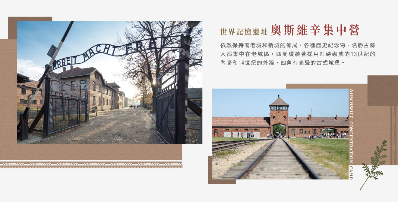 奧斯維辛集中營至今仍保留堅實裝鐵絲網的圍牆、管控的瞭望台、毒氣室及焚化場,28間屋舍內展示當年集中營裏面的歷史資料、往生者的遺物、相片及紀錄影片,殘酷的影像常令人心情久久無法平復, 1979年聯合國教科文組織將奧斯維辛集中營列入世界文化遺產,讓世人記取這一段人類生命大浩劫。