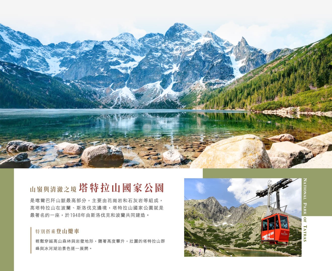 ■塔特拉山國家公園,是喀爾巴阡山脈最高部分,主要由花崗岩和石灰岩等組成,高塔特拉山在波蘭、斯洛伐克邊境,低塔特拉山全在斯洛伐克境,最高峰是2655公尺的格爾拉赫峰,山區具有阿爾卑斯式地形,很多冰洞、地下溶洞、山嶽湖泊等;斯洛伐克全國有9處國家公園,塔特拉山國家公園就是最著名的一座,於1948年由斯洛伐克和波蘭共同建造,大部份在斯洛伐克境內,僅有一小部份在波蘭境內,公園景色有一種不加修飾的質樸美,頗為幽靜和安詳野趣,是喜歡自然風光的旅行者最愛;特別搭乘★登山纜車,賞得最美的風景。