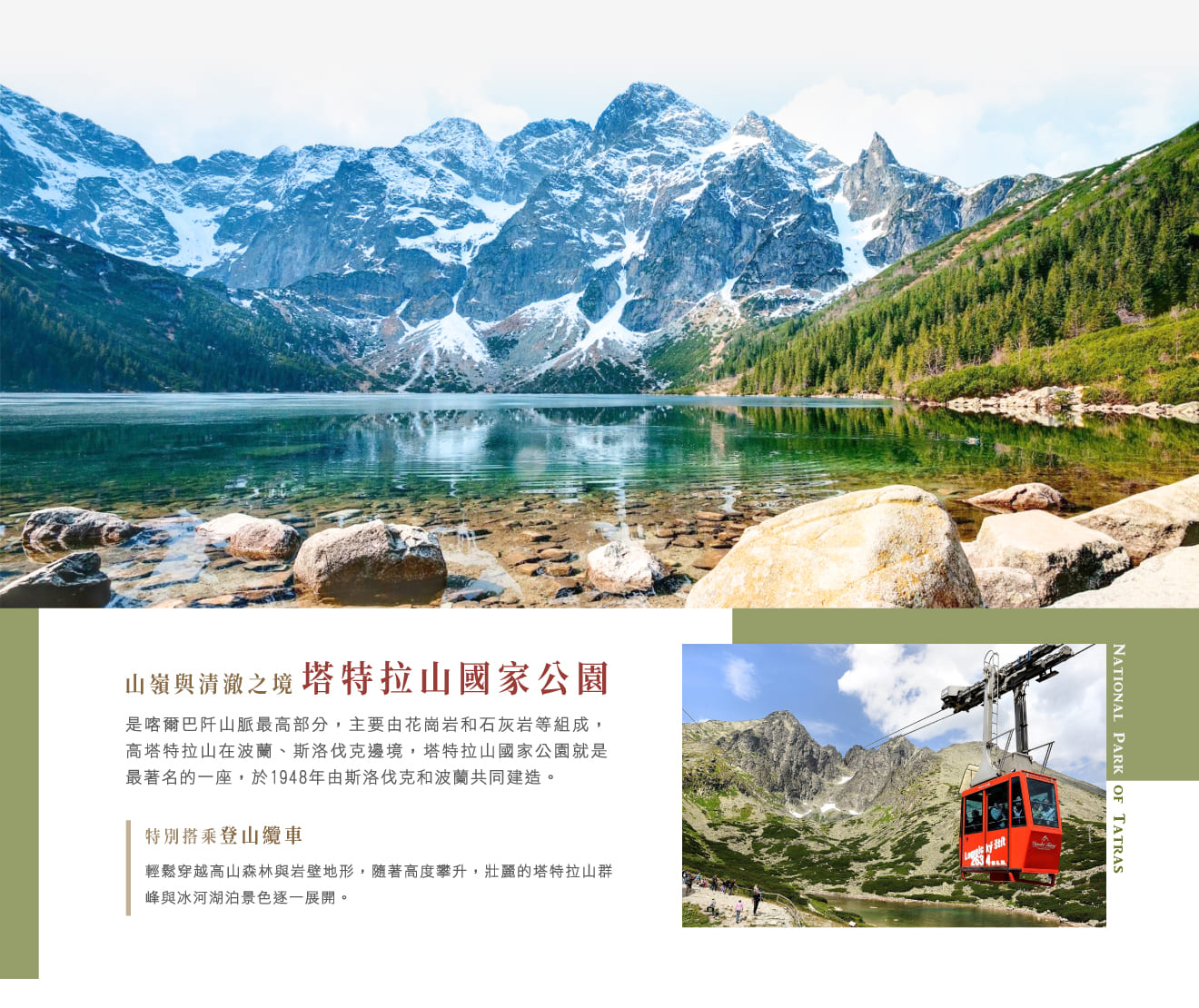 ■塔特拉山國家公園,是喀爾巴阡山脈最高部分,主要由花崗岩和石灰岩等組成,高塔特拉山在波蘭、斯洛伐克邊境,低塔特拉山全在斯洛伐克境,最高峰是2655公尺的格爾拉赫峰,山區具有阿爾卑斯式地形,很多冰洞、地下溶洞、山嶽湖泊等;斯洛伐克全國有9處國家公園,塔特拉山國家公園就是最著名的一座,於1948年由斯洛伐克和波蘭共同建造,大部份在斯洛伐克境內,僅有一小部份在波蘭境內,公園景色有一種不加修飾的質樸美,頗為幽靜和安詳野趣,是喜歡自然風光的旅行者最愛;特別搭乘★登山纜車,賞得最美的風景。