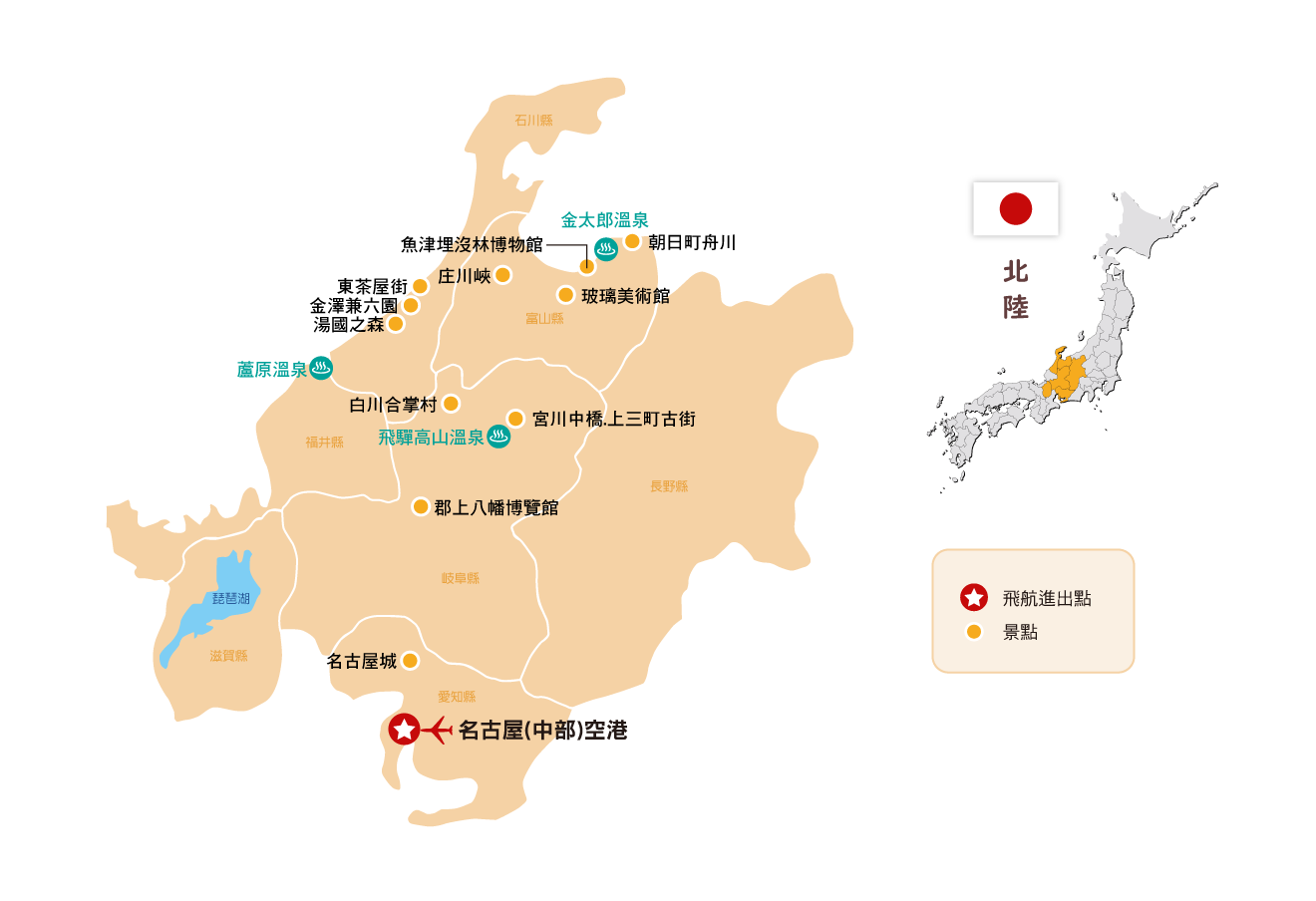 (依航班)在桃園國際機場集合,辦理出境手續後,搭豪華噴射客機飛往名古屋,展開日本溫泉美食度假之旅。
