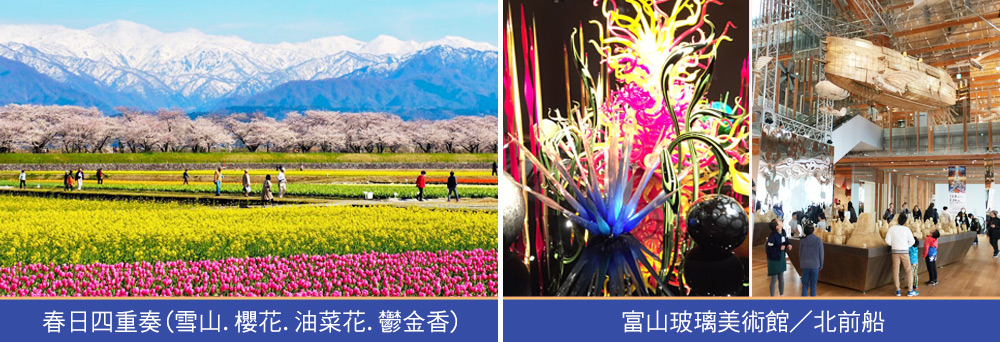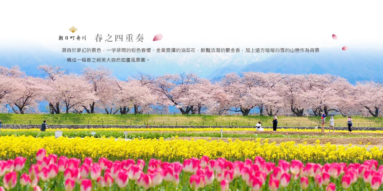 富山縣朝日町舟川「春日四重奏」,是由遠方殘雪的北阿爾卑斯山脈、河畔粉嫩的櫻花、色彩鮮艷的鬱金香,以及金黃燦爛的油菜花,堆疊交織而成的絕美景色。一整面遼闊的鮮麗色彩刺激著視覺,絕對是隱藏版的限定美景。