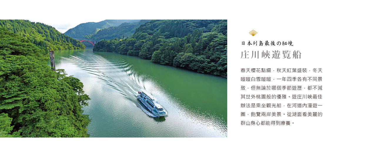 富山縣以風景優美聞名,具代表性的景點必數庄川峽。搭乘庄川峽遊覽船,欣賞深谷絕壁四季景致:櫻花點綴的春曉、新綠圍繞的常夏、紅葉盛裝的秋麗、雪白壯麗的冬曙。沿途隨著光影變化的多變水面色澤,倒影猶如名畫家的調色盤一直不停調整,時而還有飛鳥劃破這一抹寧靜,療癒造訪旅客的身心。