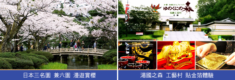 位於石川縣金澤市的「兼六園」與水戶偕樂園、岡山後樂園並列為日本三名園,因兼具『寬廣、幽雅、人力、蒼古、水泉、眺望』的景觀意境,而得名。江戶林泉迴遊式的設計,將曲折流水相映之美,發揮到淋漓盡致,其中以二足石燈籠與古松、霞之池構成一幅名園美景最具代表。巡觀光步道,參觀松石亭閣、雁行橋、曲水、四季花卉、古戰神銅像,體驗日本造園之雅致。