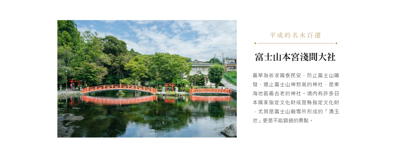 位於靜岡縣富士宮市的「富士山本宮淺間大社」,最早為祈求國泰民安、防止富士山噴發、遏止富士山神怒氣的神社,是東海地區最古老的神社。境內有許多日本國家指定文化財或是縣指定文化財,尤其是富士山融雪所形成的「湧玉池」更是不能錯過的景點,不但被指定為日本的「國家特別天然紀念物」,也被選為「平成的名水百選」。