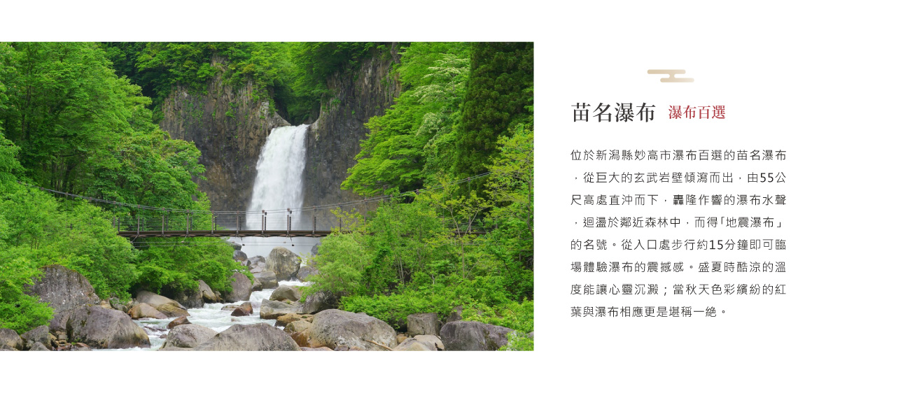 位於新潟縣妙高市瀑布百選的苗名瀑布,從巨大的玄武岩壁傾瀉而出,由55公尺高處直沖而下,轟隆作響的瀑布水聲,迴盪於鄰近森林中,而得「地震瀑布」的名號。從入口處步行約15分鐘即可臨場體驗瀑布的震撼感。盛夏時酷涼的溫度能讓心靈沉澱;當秋天色彩繽紛的紅葉與瀑布相應更是堪稱一絶。