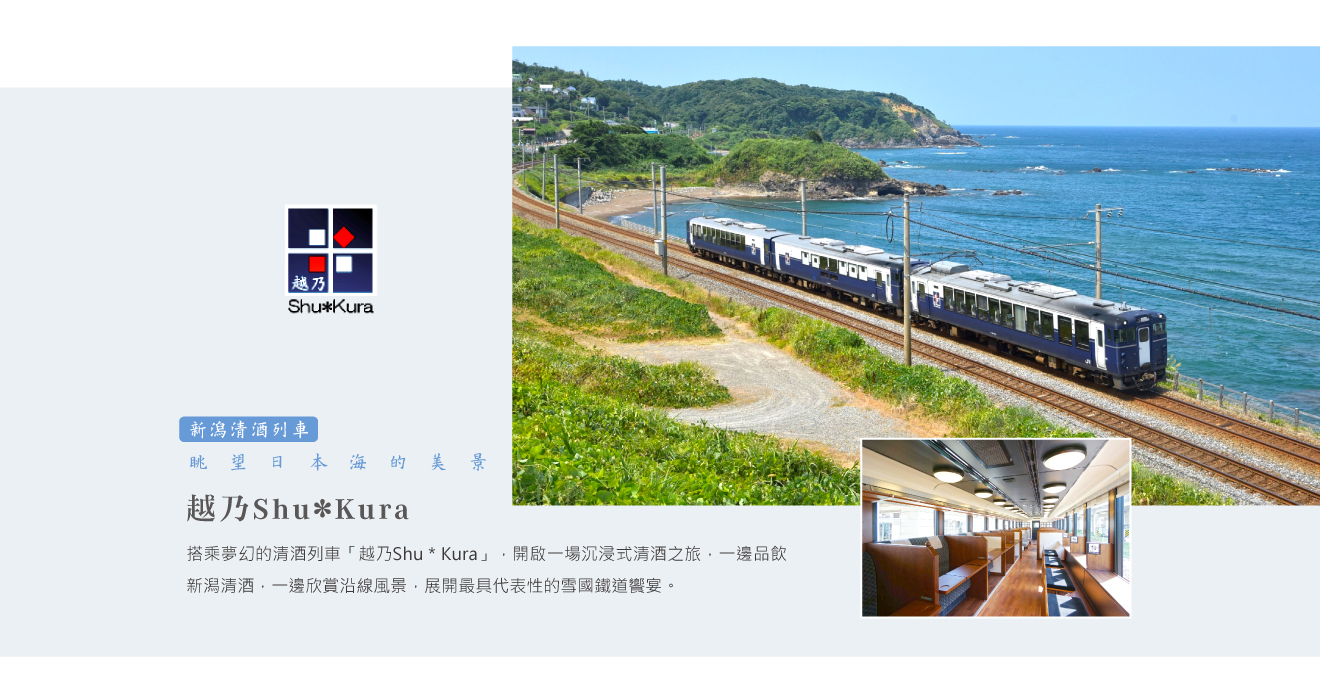 搭乘夢幻的清酒列車「越乃Shu*Kura」,開啟一場沉浸式清酒之旅,一邊品飲新潟清酒,一邊欣賞沿線風景,展開最具代表性的雪國鐵道饗宴。