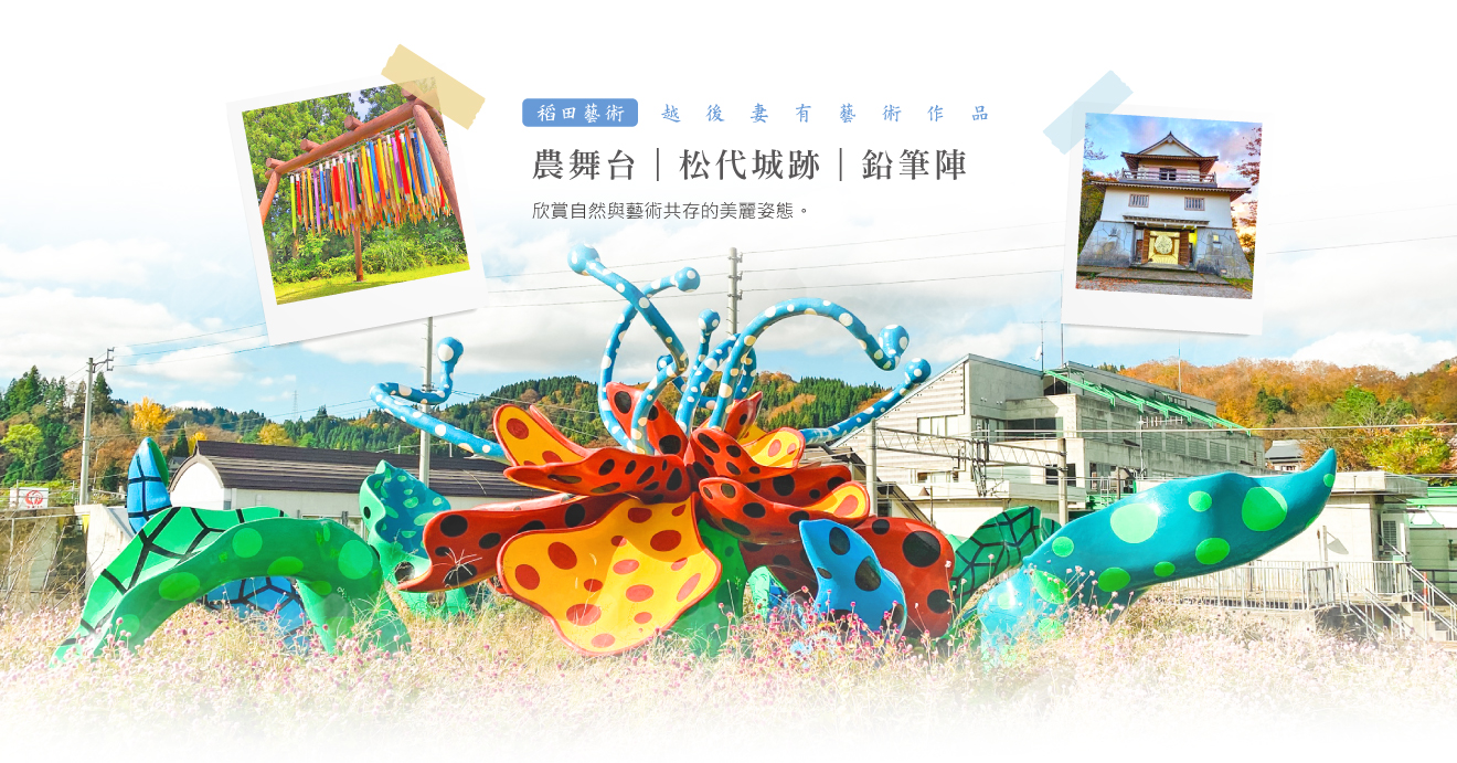 位於新潟縣十日町市的松代「農舞台」,由荷蘭建築師MVRDV所設計,建築本身就是藝術,是一座集結越後妻有「大地藝術祭之鄉」各式各樣元素的野外博物館。在大自然之中佇立著草間彌生等世界各地藝術家的作品,可欣賞自然與藝術共存的美麗姿態。