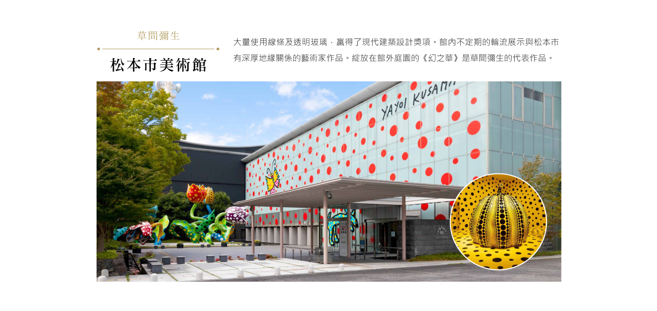 位於長野縣的松本市美術館,大量使用線條及透明玻璃,贏得了現代建築設計獎項。館內不定期的輪流展示與松本市有深厚地緣關係的藝術家作品。綻放在館外庭園的《幻之華》是草間彌生的代表作品。草間彌生的作品以鮮豔的色彩、圓點及無限延伸的鏡像為元素,強烈鮮明且富有其特殊的生命力,為美術館之行增添樂趣。