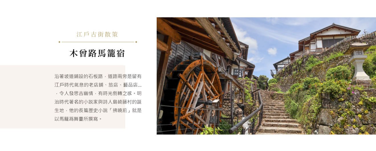 位於岐阜縣中津川市木曾路上最南端的宿場「馬籠宿」,江戶時期曾是提供旅人中途停靠的宿場町而繁盛。沿著坡道鋪設的石板路,道路兩旁是留有江戶時代氣息的老店舖、旅店、藝品店…,令人發思古幽情,有時光倒轉之感。明治時代著名的小説家與詩人島崎藤村的誕生地,他的長篇歷史小説「拂曉前」就是以馬籠爲舞臺所撰寫。