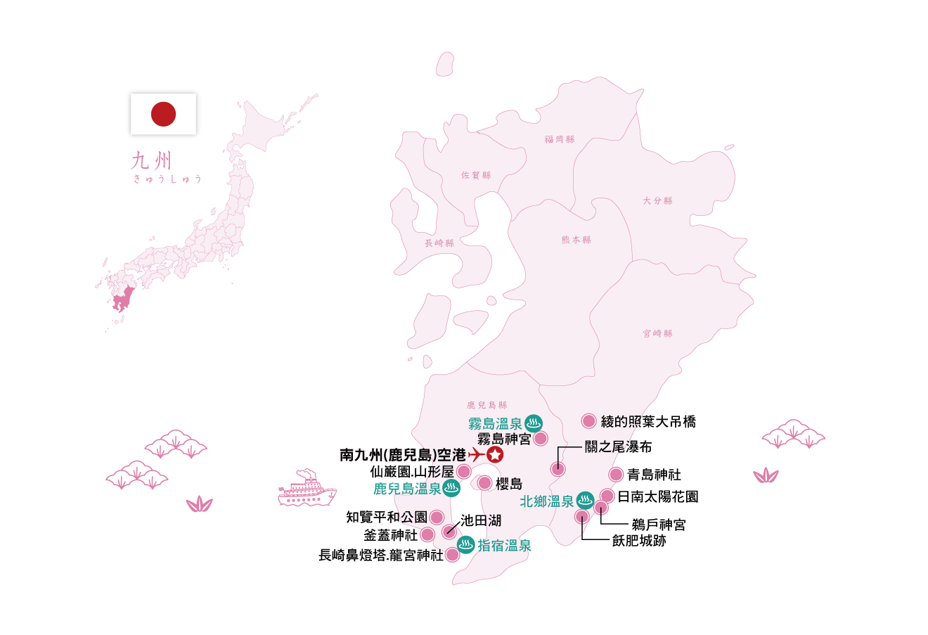 (依航班)在桃園國際機場集合,辦理出境手續後,搭噴射機客機直飛往南九州抵鹿兒島上空,往下望,裊裊冒煙的櫻島活火山,秀麗錦江灣之都鹿兒島令人雀躍。抵後展開南九州溫泉美食度假之旅。