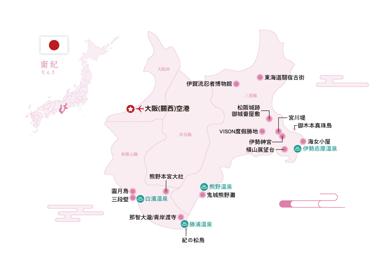 位於和歌山縣東牟婁郡那智勝浦町的那智瀑布「那智大瀑」,與栃木縣的「華嚴瀑布」、茨城縣的「袋田瀑布」,並稱為日本三大名瀑。瀑布宛如一縷白絹垂掛在山谷間,從絕壁上直瀉而下,磅礡迴盪的水聲和充滿空氣的水霧,頗有中國山水畫的視覺美感,嘆大地造景之神奇。