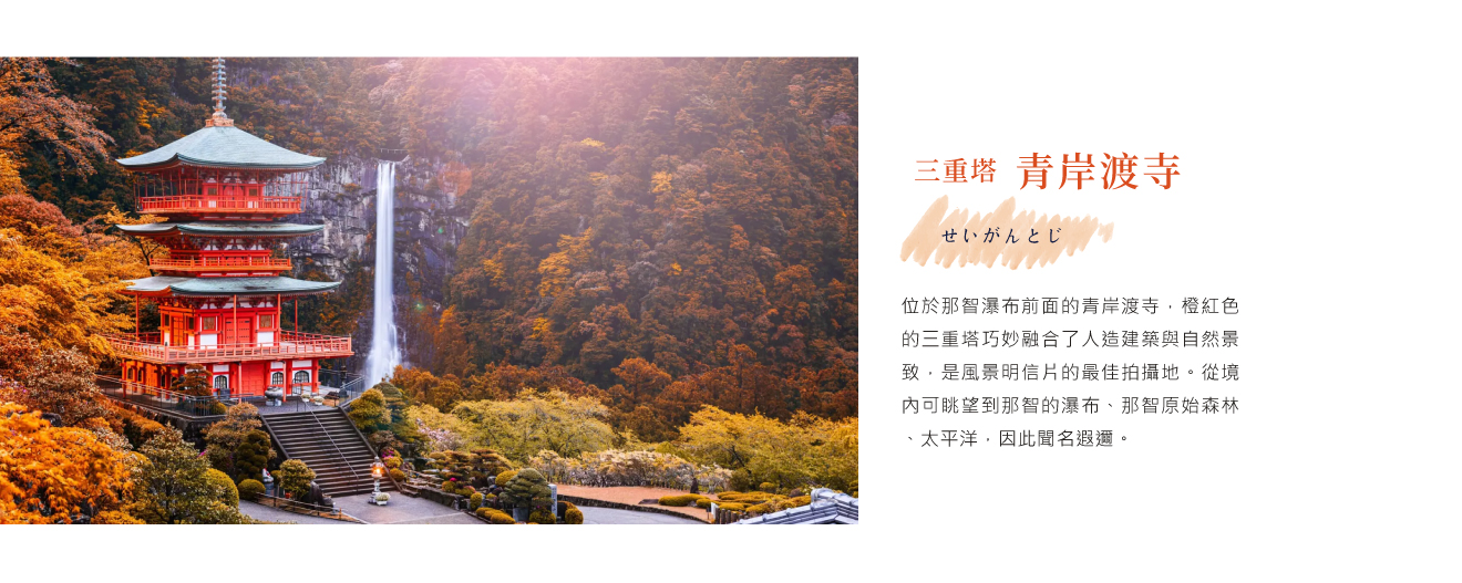 位於那智瀑布前面的青岸渡寺,朱紅色的三重塔巧妙融合了人造建築與自然景致,是風景明信片的最佳拍攝地。從境內可眺望到那智的瀑布、那智原始森林、太平洋,因此聞名遐邇。