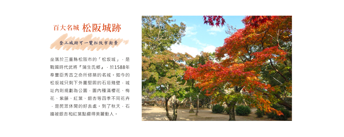 坐落於三重縣松阪市的「松坂城」,是戰國時代武將『蒲生氏鄉』,於1588年奉豐臣秀吉之命所修築的名城。如今的松坂城只剩下外圍堅固的石垣殘壁,城址內則規劃為公園,園內種滿櫻花、梅花、紫藤、紅葉、銀杏等四季不同花卉,是民眾休閒的好去處。到了秋天,石牆被銀杏和紅葉點綴得美麗動人。另外,登上城跡可一覽松阪市街景,感受君臨天下的豪氣。