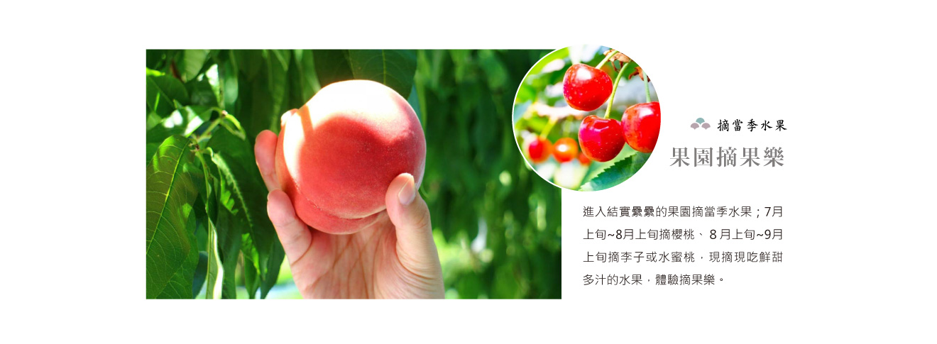 進入結實纍纍的果園摘當季水果;7月上旬~8月上旬摘櫻桃、8月上旬~9月上旬摘李子或水蜜桃,現摘現吃鮮甜多汁的水果,體驗摘果樂。