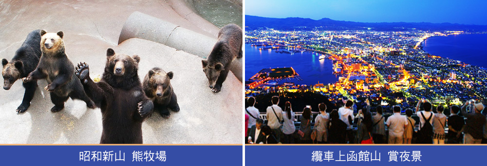 洞爺湖溫泉─果園(摘當季水果)─(昭和新山)活火山奇觀.熊牧場─(休息站)噴火灣全景公園─搭纜車(上函館山)賞函館夜景─函館溫泉