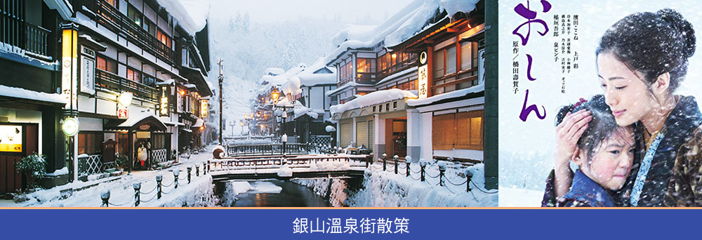 位於山形縣尾花澤市山谷中的「銀山溫泉」,早年因開採銀礦而得名,更因日劇《阿信》曾在此拍攝而風靡一時。銀山川清冽的河水穿流其中,配上兩旁木造古建築旅館,充滿大正浪漫風情。散步其中,思「阿信,不向命運低頭,艱忍奮鬥的一生」。阿信的媽媽在銀山溫泉「能登屋」旅館做雜役,現還在,阿信被酒田米店主管欺侮,說她偷一銀元,受委屈,在雪花中哭著奔來銀山找媽媽,曾在此旅館與媽媽住一夜,讓人賭物思情。冬季古樸建築與皚皚白雪,交織成浪漫場景,令它成為現時日本人最流行的度假景點。