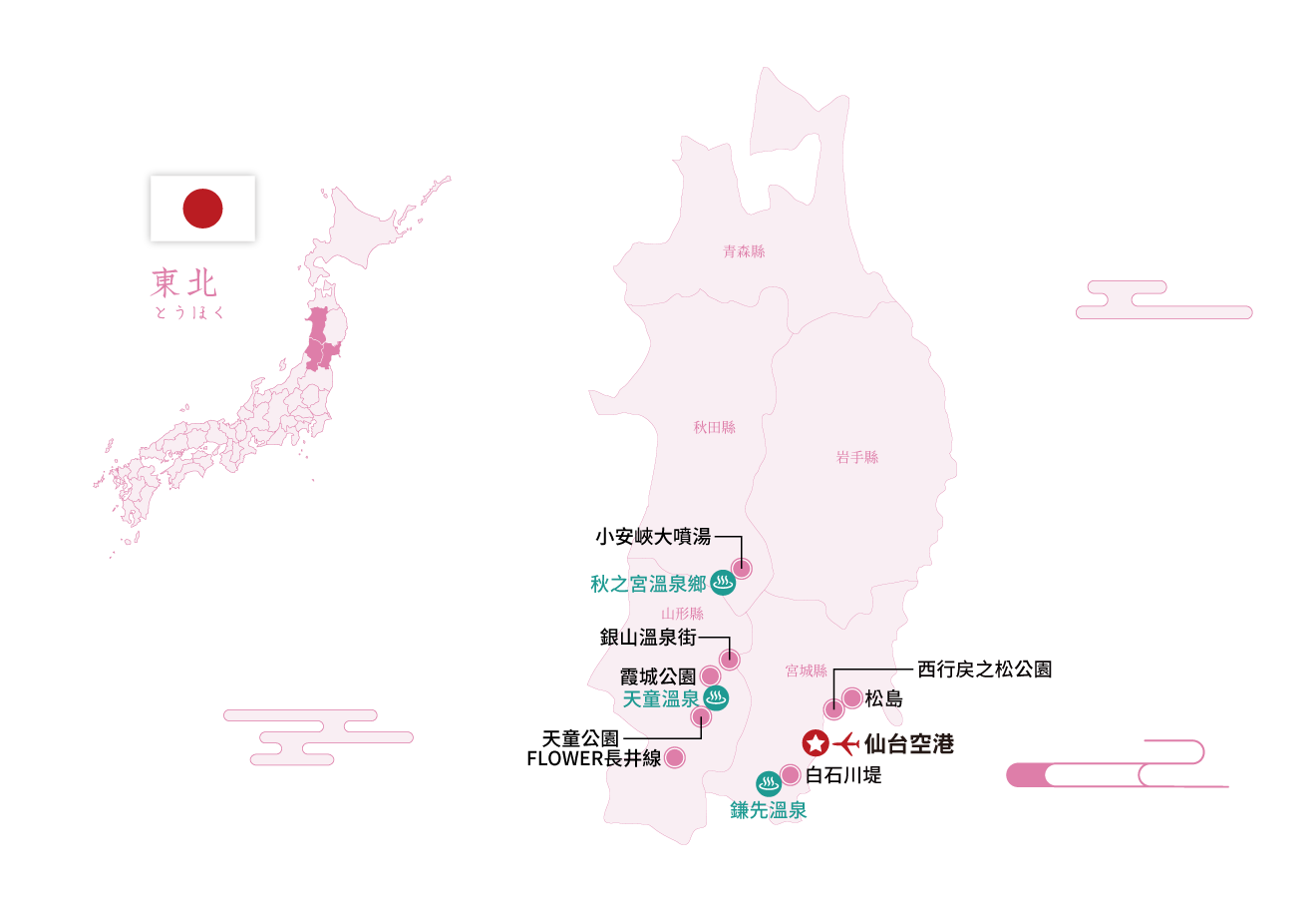 精選東北四大櫻花名所:松島、西行戻松、銀山溫泉、白石川一目千本櫻一次收錄。