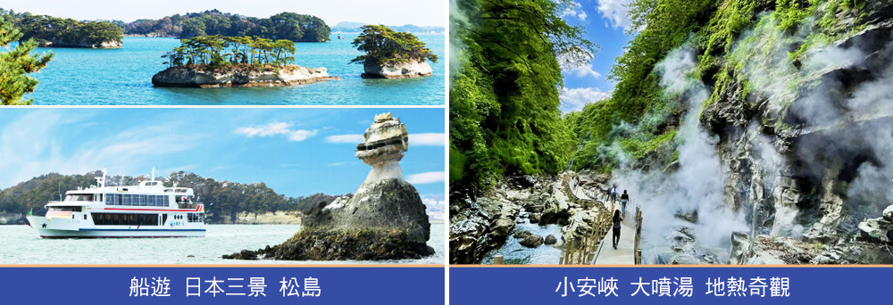 仙台─(賞櫻名所)西行戻之松公園─搭遊覽船(迴遊松島奇岩)海景奇觀─笹蒲手燒體驗+糰子點心─小安峽(大噴湯)地熱奇觀─秋之宮溫泉鄉