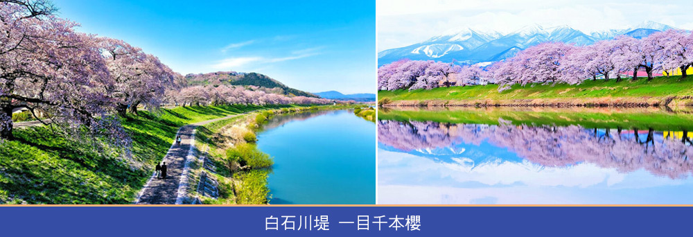 位於宮城縣柴田郡賞櫻名所的白石川堤,每到花季,兩岸一望無際櫻花林並列盛開與遠方尚留殘雪的藏王連峰相映,花與山水交織的絕景地,被譽為日本最壯觀的櫻花大道之一。