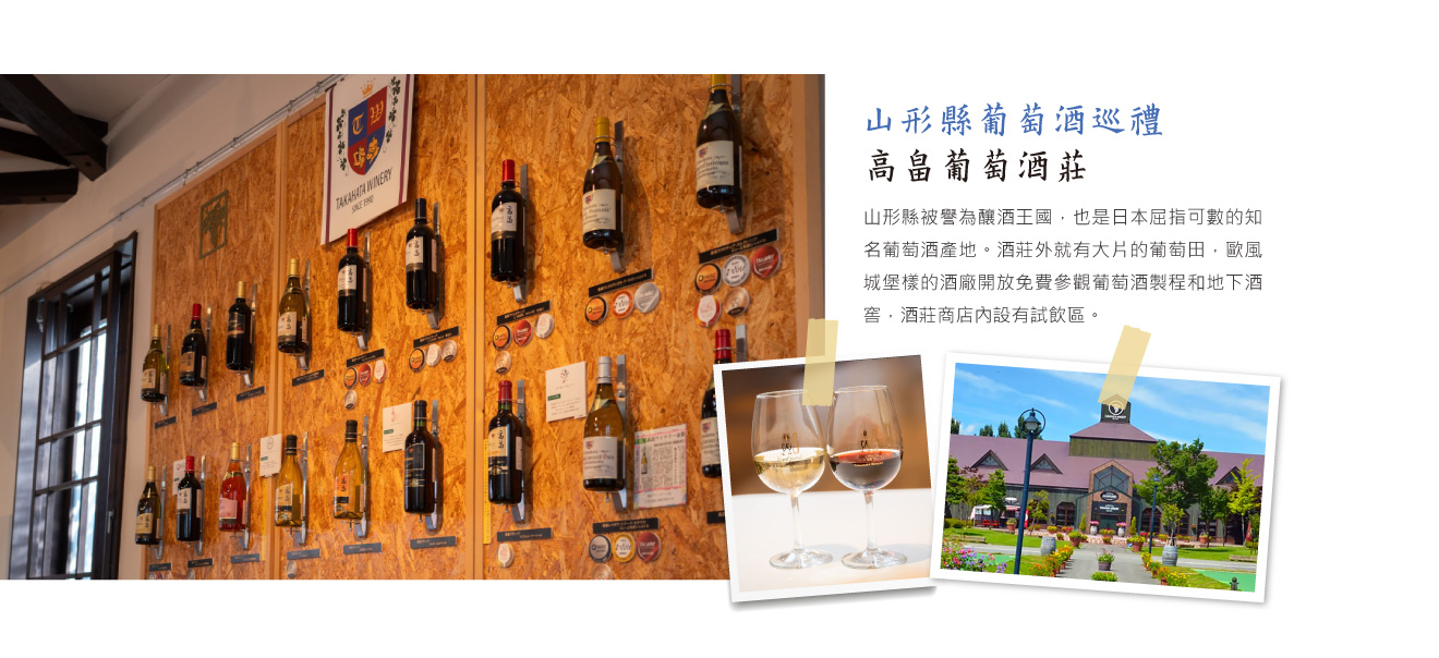 位於山形縣東置賜郡高畠町的「高畠葡萄酒莊」,以生產高品質、屢獲國際獎項的葡萄酒而聞名。酒莊外就有大片的葡萄田,歐風城堡樣的酒廠開放免費參觀葡萄酒製程和地下酒窖。酒莊商店內設有試飲區,並有具備侍酒師資格的專業人員,協助遊客挑選最合心意的葡萄酒。