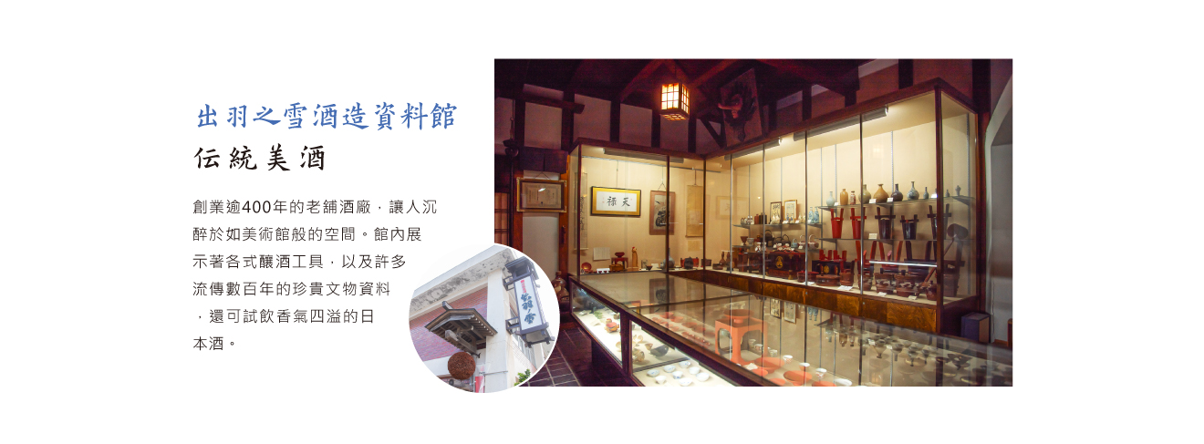 位於山形縣鶴岡市大山地區的「出羽之雪酒造資料館」,創業逾400年的老舖酒廠,讓人沉醉於如美術館般的空間。館內展示著各式釀酒工具,以及許多流傳數百年的珍貴文物資料,還可試飲香氣四溢的日本酒。