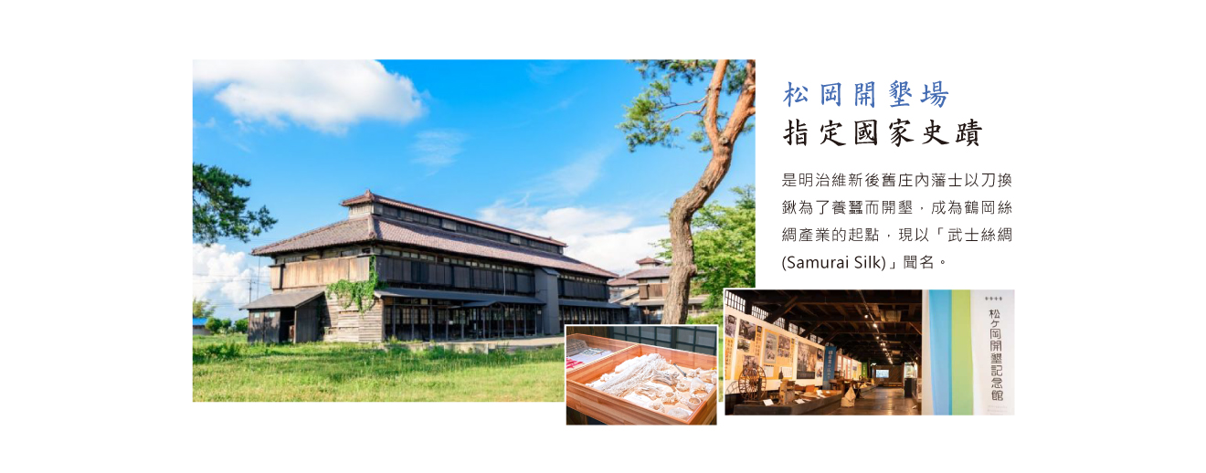 位於山形縣鶴岡市羽黑町的松岡開墾場,現為指定國家史蹟。是明治維新後舊庄內藩士以刀換鍬為了養蠶而開墾,成為鶴岡絲綢產業的起點,現以「武士絲綢(Samurai Silk)」聞名。